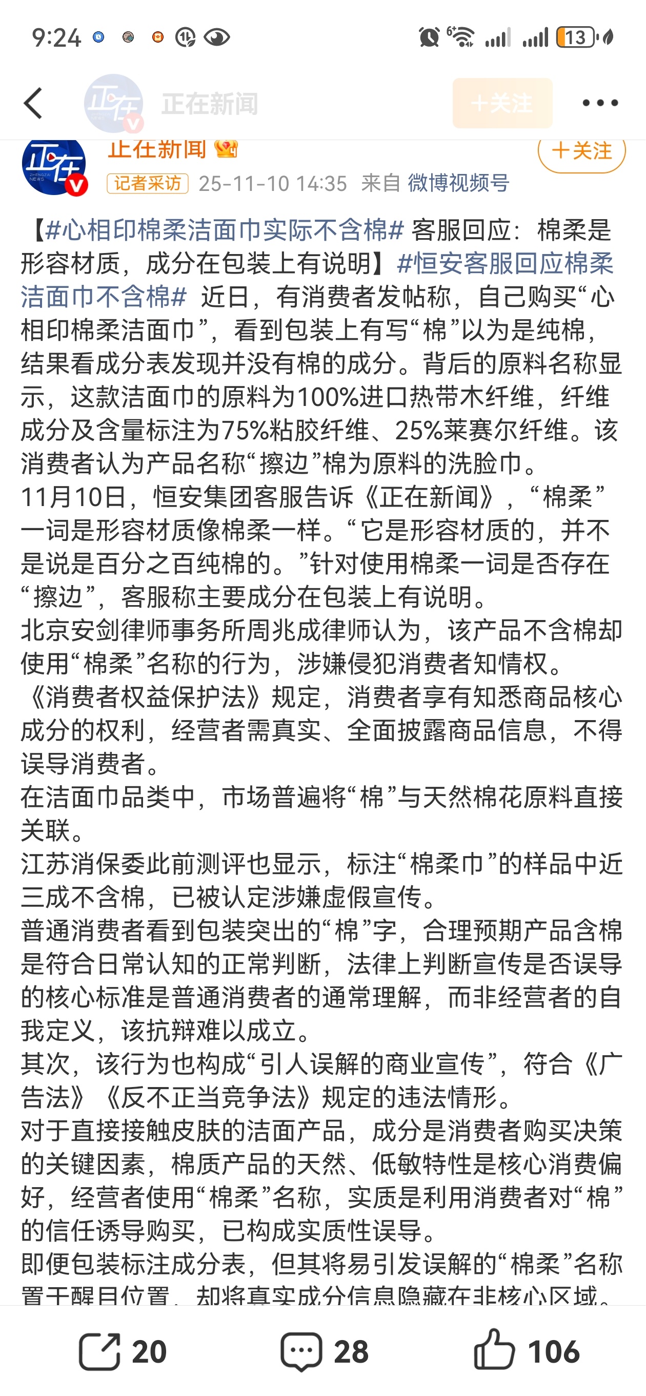 没用过这个品牌恒安客服回应棉柔洁面巾不含棉心相印棉柔洁面巾实际不含棉