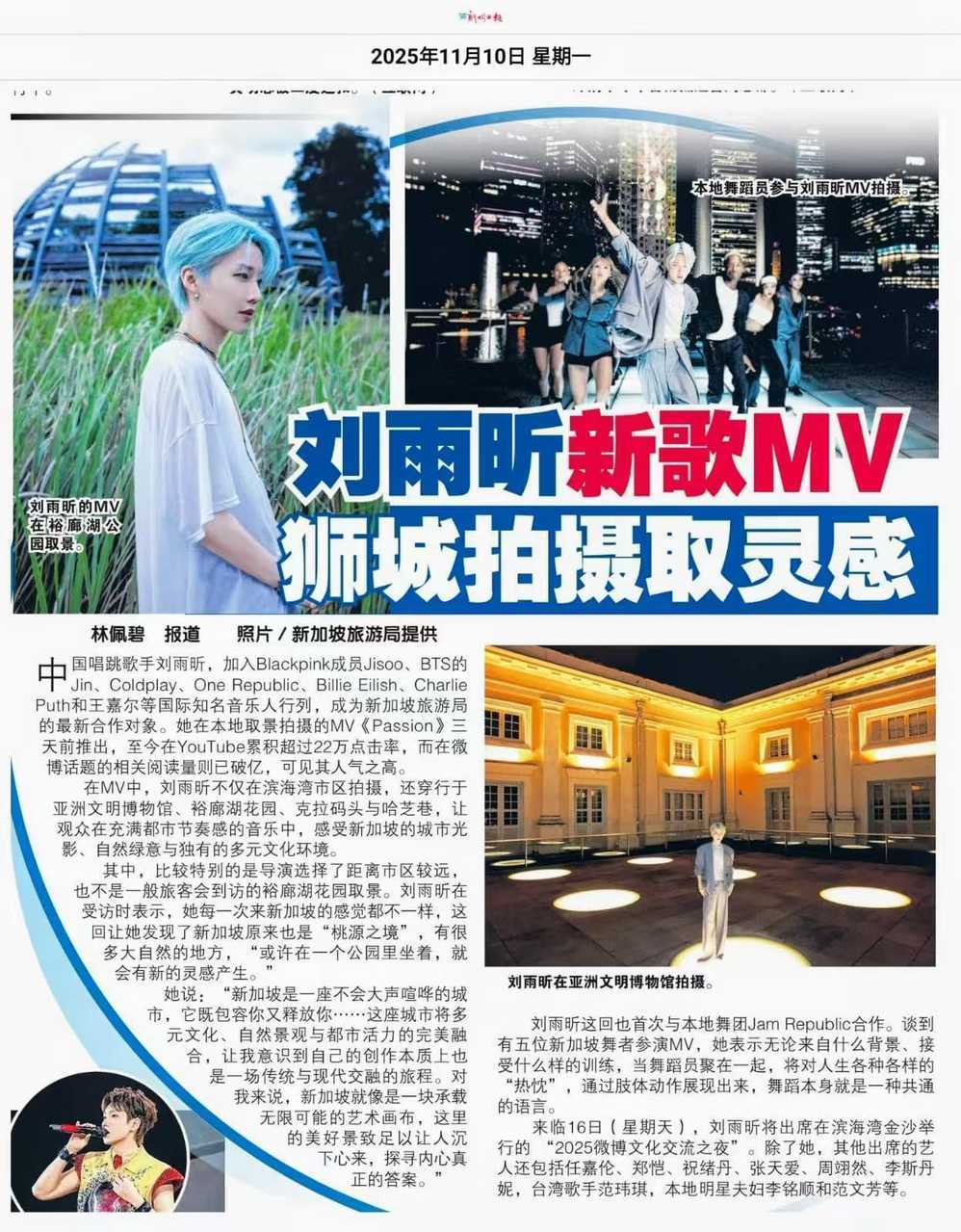 新加坡新明日报大篇幅报道了刘雨昕🔥内娱首位加入新加坡旅游局官方合作并拍摄MV,海外影响力🐮