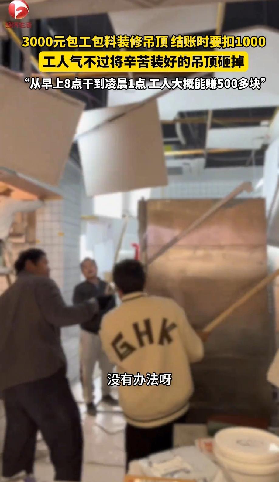 太过分了!湖北武汉,工人3000元包工包料装修吊顶,好不容易从早上八点干到第二天凌晨一点完工,结账时却被告知要扣1000元,工人一听瞬间不干了,辛辛苦苦干了17个小时,现在却要扣钱,相当于白干了一天活,还要倒贴钱。于是,工人一气之下将辛苦装好的吊顶全部砸掉了。 事情得从一单吊顶活说起,喻先生接了位老板的装修单子,是家餐饮店的吊顶安装,双方早就谈好3000块钱,包工包料一口价,材料、人工全包含在内。 喻先生派了工人上门施工,工人从当天早上8点就开工了,爬上爬下测量、切割、装龙骨、铺板材,一刻没闲着。 装修这活儿本就费体力,全程站着不说,还得精准把控尺寸和平整度,工人午饭就简单对付一下,渴了就喝点凉水,一直干到凌晨1点,整整17个小时才把所有吊顶装好。 活儿干完了,工人收拾好工具等着结账,没想到老板验收时突然变了卦。 老板说吊顶有些小瑕疵,不太满意,直接提出要扣1000块钱,不然就一分钱都不给。 喻先生也实在,他自己都承认工人的活儿确实有小问题,所以主动跟老板协商,说愿意承担300到400块钱的整改费,也算给老板一个交代,可老板态度特别强硬,一口咬定“要拿钱就必须扣1000”,没有任何商量的余地。 这就让人没法接受了。喻先生算得明明白白,3000块钱里刨去材料成本,工人辛苦17个小时,到头来也就赚500多块钱。 现在一下要扣1000,相当于工人不仅白干一天一夜,还得倒贴钱,换谁能咽得下这口气? 工人当场就急了,跟喻先生说:“这钱我不要了,顶是我花钱买材料装的,我宁愿拆了也不让他白用!” 说着就拿起工具,把刚装好的吊顶一块块拆了个干净,算是出了这口憋在心里的气。 后来包工头报了警,警察赶到现场了解情况后,也没多说什么,意思很明确:不管吊顶有没有小问题,一下子扣工人这么多钱,确实不应该。 这件事传到网上,网友们的看法分成了两派。 支持工人的网友占了大多数,纷纷表示17个小时的血汗,就赚500多,扣1000太欺负人了!拆得好,不蒸馒头争口气。 也有少数网友觉得两边都有问题,工人活儿有瑕疵是事实,老板扣钱也情有可原,但扣太多了。 还有网友吐槽,装修行业没合同真不行,口头约定说变就变,受伤的还是打工人。 在我看来,工人的做法虽然看着“极端”,但完全能理解。 喻先生已经主动让步愿意承担整改费,说明他们不是不讲理的人,可老板的做法实在太过分,拿着“验收权”就随意克扣报酬,这根本不是挑毛病,而是明着欺负人。 工人拆吊顶不是为了报复,而是为了捍卫自己的劳动尊严。 喻先生在采访里说:“跟他低头道歉解决不了,没有办法。” 这句话说出了多少打工人的无奈。打工人不怕吃苦,17个小时连轴转他们能扛,活儿有小问题他们也愿意整改,但就怕辛苦付出后被随意拿捏,怕应得的报酬被无理克扣。 这件事说到底,争的不是500多块钱,而是一口气,是对劳动的尊重。 不管是老板还是打工人,人与人之间的相处都该讲规矩、守底线。老板尊重工人的血汗,工人才能用心干活;反过来,工人认真负责,老板也能放心。