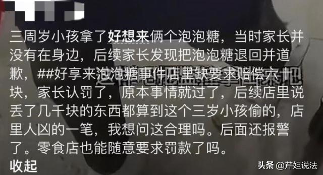 苏州,一位妈妈,带着3岁的孩子,走进一家叫做“好想来”的零食超市购物。3岁宝宝误拿了两块泡泡糖走出超市,妈妈及时发现,赶紧带着孩子回到柜台边付款。孩子妈妈带着孩子道歉,并且称不小心拿了两块泡泡糖,愿意赔偿60元。本来也就两块钱的事情,妈妈也提出愿意赔偿60元,但是超市老板娘却非常气愤,继续不依不饶,声称这个3岁的小孩拿走了几千元的产品! “店员凶的不得了!”孩子爸爸闻讯赶来,过来的时候,零食铺的店员正在大声凶孩子。深圳新闻网11月10日报道了这则新闻。据报道称,零食铺的老板娘当时坚称,就是孩子偷走了几千元的零食,但是又拿不出切实的证据。 一位妈妈,带着3岁的孩子,走进了一家零食店铺。准备离开的时候,孩子手里误拿了两块泡泡糖,刚走到门口,就被妈妈给看到了。 妈妈非常有素质,带着孩子回到柜台边,先跟零食铺老板真诚道歉,并且表示,愿意付出赔偿。妈妈说,可以赔偿60元给零食店。 这个时候,走过来一个女店员,上来就态度恶劣,话里话外带着嘲笑,同时还声称:“你家孩子,拿走了我们几千元的货品!” 听到这话,妈妈就不乐意了。第一,她发发现自己孩子顺走拿了两块泡泡糖,这确实是孩子的不对,她也带孩子来道歉了;第二,泡泡糖也就两块钱,妈妈提出愿意赔偿60元,但是对方居然还不情愿;第三,店员又开始随意诬陷小孩,这么小的孩子,可以偷走几千元的零食?这得用卡车来装,才能拉走吧? 妈妈指出,“请出示监控摄像。如果有切实的证据,别说按照货款的10倍、就算100倍,今天我也照价赔偿。但是拿不出证据,你们不仅要给我孩子道歉,我还要报警、要上诉你们!” 但是店员却很别扭,一时间又拿不出证据。妈妈打电话,喊来了孩子爸爸。孩子爸爸到场之后,发现店员正在恶狠狠的跟孩子妈妈吵架,一旁的小孩蹲在地上,看来也是吓得不轻。 爸爸非常生气,询问店员究竟是丢失了怎样的货品价值几千元。店员看到有男性过来,又开始很凶悍的怒怼孩子的爸爸。 最后,孩子爸爸选择了报警,这件事一定要讲个理所当然来,随意污蔑、甚至诋毁小孩子,这个是绝对不能容忍的。 民警介入调查之后,有记者跟这家零食店铺联系,但是店铺一直拒接电话、也不肯作出回应。目前,这家“好想来”零食铺仍然还在运营中。 1.3岁小孩误拿了超市的两块泡泡糖,妈妈发现之后立刻道歉,并且表示愿意赔偿60元,妈妈的行为是否合理呢? 根据《民法典》规定,监护人对未成年具有监护职责,如果未成年孩子犯错,监护人需要对未成年人进行批评教育,并且对造成的损害承担赔偿责任。 两块泡泡糖价值2元,但是妈妈发现之后,通过实际行动,教会孩子犯错需要道歉,损坏东西需要赔偿,当场表示愿意赔偿60元。妈妈的做法已经尽到监护人职责,做法完全符合法律要求。 2.零食铺店员污蔑3岁小孩,称其偷走几千元的零食货品,但是又拿不出监控证明,店员的行为是否违法呢?给孩子心理造成影响,店员要承担刑罚吗? 根据《治安管理处罚法》规定,随意诬告他人,其行为构成侮辱或者诽谤,虽然情节尚不构成犯罪,但是行为人可能会面临行政处罚或者处以罚金。 如果诬告、损害的行为比较严重,诬蔑孩子,给孩子造成心理阴影、导致孩子身心受到严重伤害,根据《刑法》规定,行为人可能构成诬告陷害罪,会面临有期徒刑、拘役管制的刑事处罚。 面对小孩的道歉、妈妈的赔偿,店员仍然不依不挠,坚称孩子偷走几千元产品,但是又拿不出切实的证据作证,单凭两张嘴,随意就给孩子“定罪”,造谣的成本是否也太低了呢? 如果确实有未成年小孩,或者是不具备完全行为人的幼童,误拿了产品,应该悄悄告知对方父母或者其他监护人,而不应该大声宣扬。 没有掌握确切的证据,这些店员就吵得人尽皆知,伤害的还是未成年人的心灵。早之前就有一位10岁小朋友,因为文具店老板误解、相逼,最后导致孩子想不开轻生。 这样的诋毁尽量还是少一些,即使掌握了确凿证据,细声跟孩子妈妈交流,未尝不是更好的方式呢,跟孩子有什么深仇大恨呢? 希望尽快调查清楚,还3岁小孩一个公道。如果店员确实诬陷,请给小孩道歉。对此,大家都怎么看待呢?