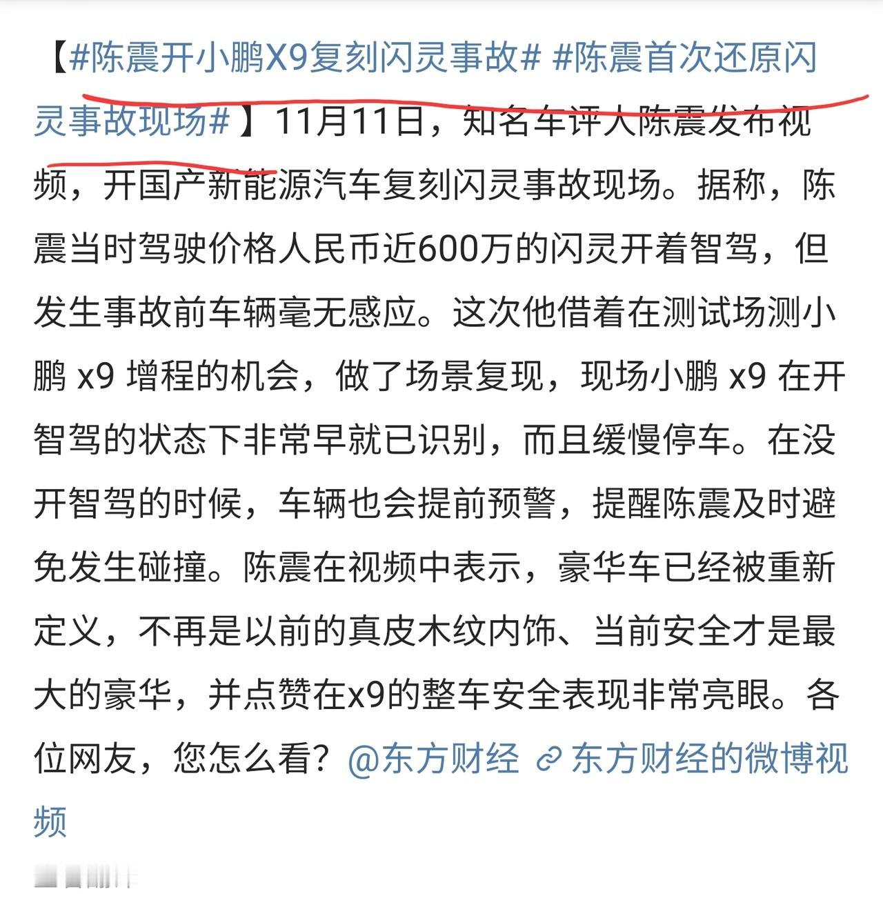 何小鹏又笑开花了,上次是机器人的事情赢麻了,这次汽车方面又赢了。 大网红陈震在测试场地,还原了自己上热搜的劳斯莱斯闪灵事故场景,没想到,这次开小鹏的车,一点安全顾虑没有,自动驾驶安稳停下了。 据悉,之前陈震在驾驶劳斯莱斯电车的时候,走神了,直接跟对向车辆相撞,差点把劳斯莱斯给撞毁了 周四在实验上开始情况,平时自动驾驶同样是对向车道,试了几次都安稳挺住 这说明什么,说明我们国产车的智能驾驶水平,已经非常高了