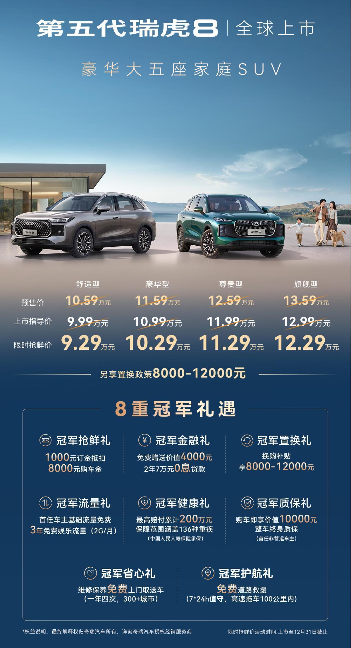 奇瑞瑞虎8上市,售价9.99万-12.99万元,12月31日前可享限时权益价9.29万-12.29万元。新车搭载1.6T发动机+7速湿式双离合变速箱,最大功率147kW,峰值扭矩310N·m。【来自懂车帝车友圈】