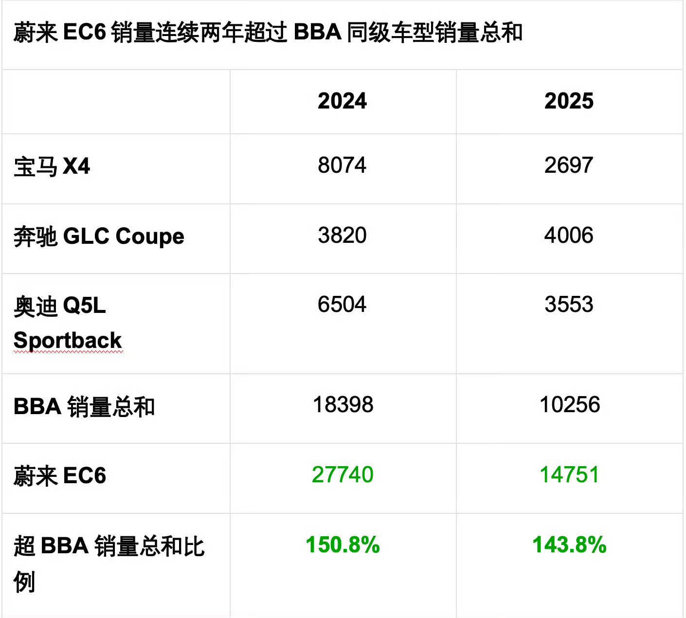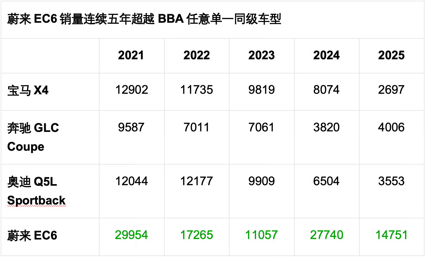 如今,EC6成为了中国首个突破10万交付大关的纯电轿跑SUV车型,大家可以看看它和同类型豪华车的销量对比列表。它连续五年销量力压BBA同级轿跑SUV,自2024年起更连续两年单车销量超过BBA同级车型销量总和。