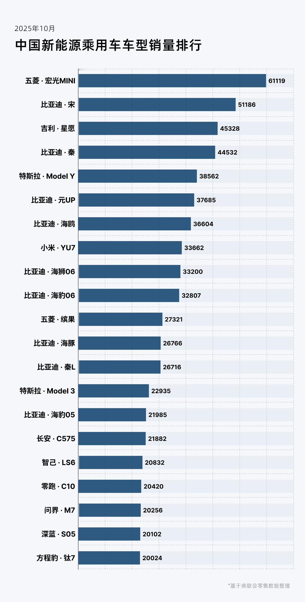 10月新能源汽车销量榜 ! 五菱宏光mini EV是卖的最好的,卖了6万多台,这里面有一个例外就是小米YU7,这个价格是前10里面卖的最贵的车型,而且是卖的非常好的。 从这个图里面就能看出来消费者的选择是什么,从品牌上来看,比亚迪是当之无愧的第一。 现在新能源市场的区别真的是非常的大,不同价位的车型都有不同的消费人群,也不是说一定是价格便宜的卖的好,也不是说一定是价格贵的卖的好。 各位是怎么看的?欢迎评论区留言。