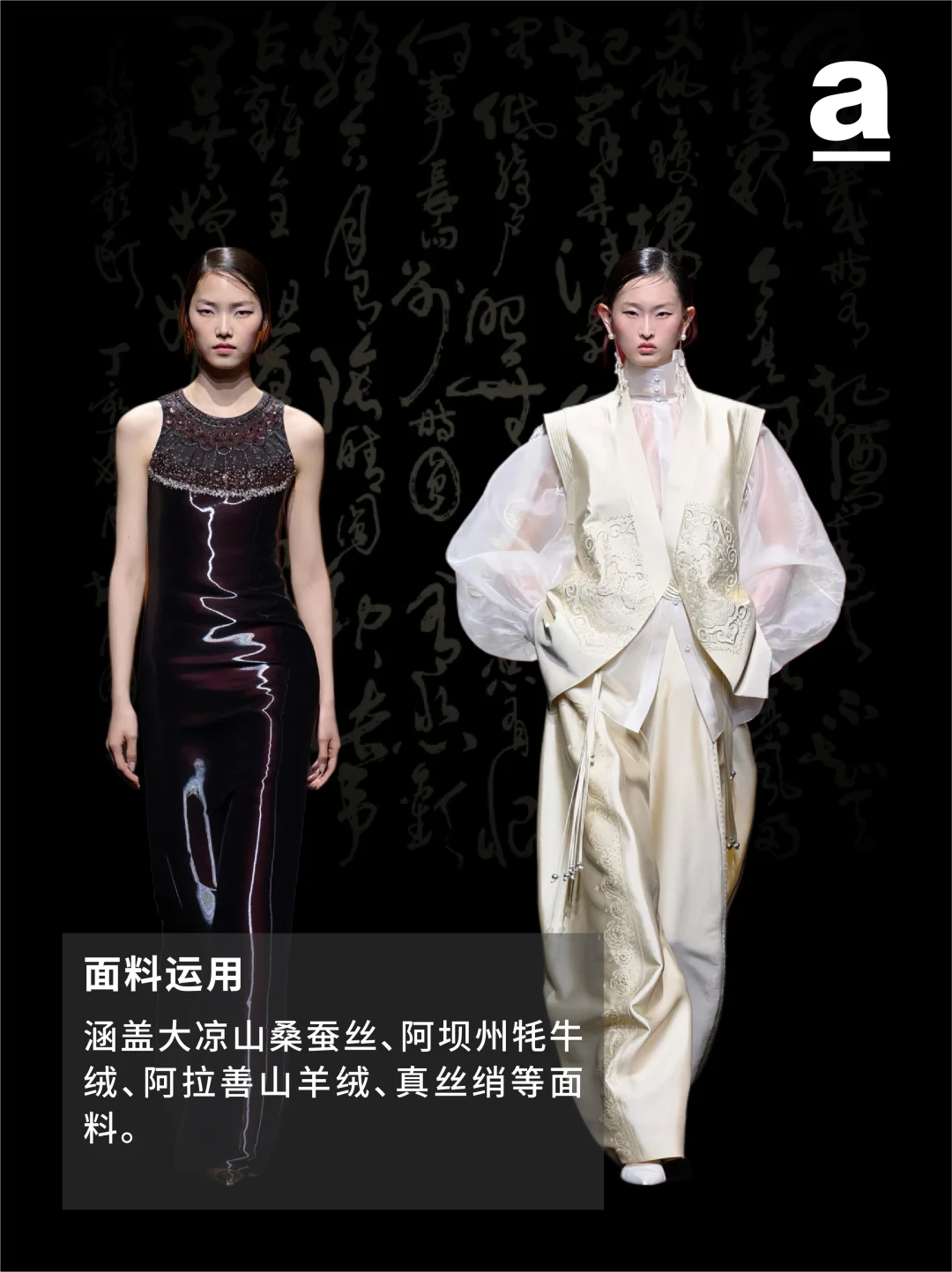和苏绣传承人共创的牡丹纹样,有的像水墨晕染,有的似工笔细描,在真丝绡纱的褶裥间随呼吸起伏,美到窒息。还有黔南民族图腾、苗族剪纸元素的跨界,鱼龙幻化、蝶翼通天的古老图案,用刺绣和扎染工艺点缀在现代廓形上,绚而不繁。