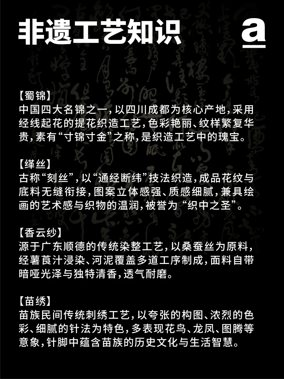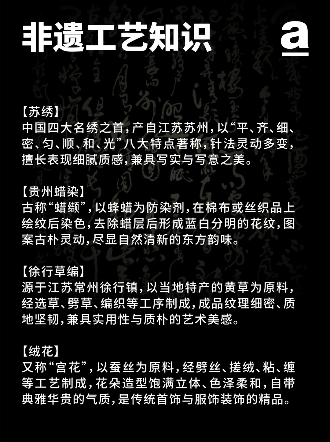 设计里全是巧思:衣襟绣着《离骚》里的兰草,暗合“香草美人”的高洁寓意,楚国龙凤纹样在织物间蜿蜒,浪漫紫色调精准还原诗篇的瑰丽意境。更绝的是八大非遗工艺的融入,苏绣的细腻、贵州蜡染的古朴、徐行草编的天然,尤其是草编包搭配绣花图案,古早质感和现代风格完美契合。