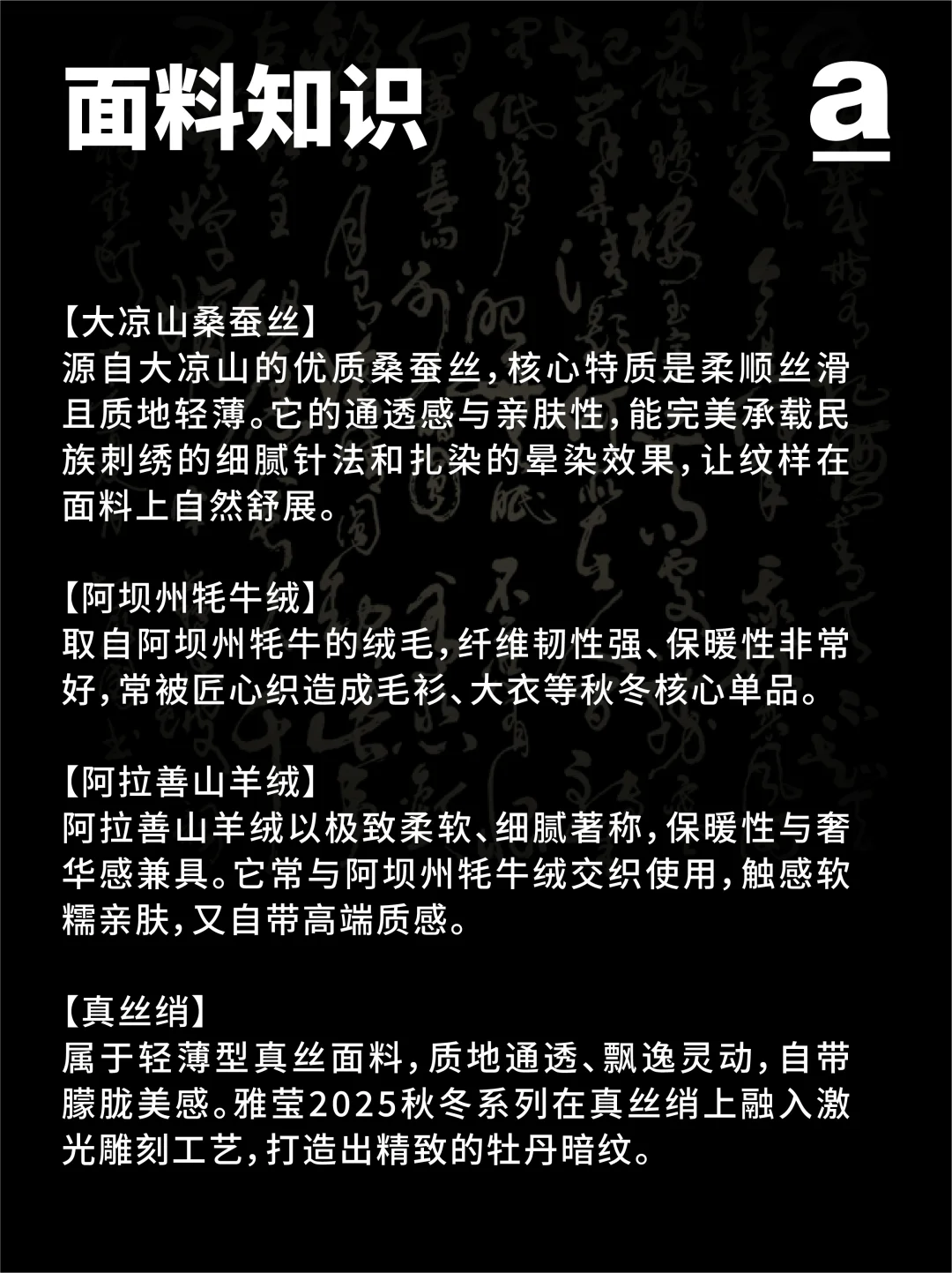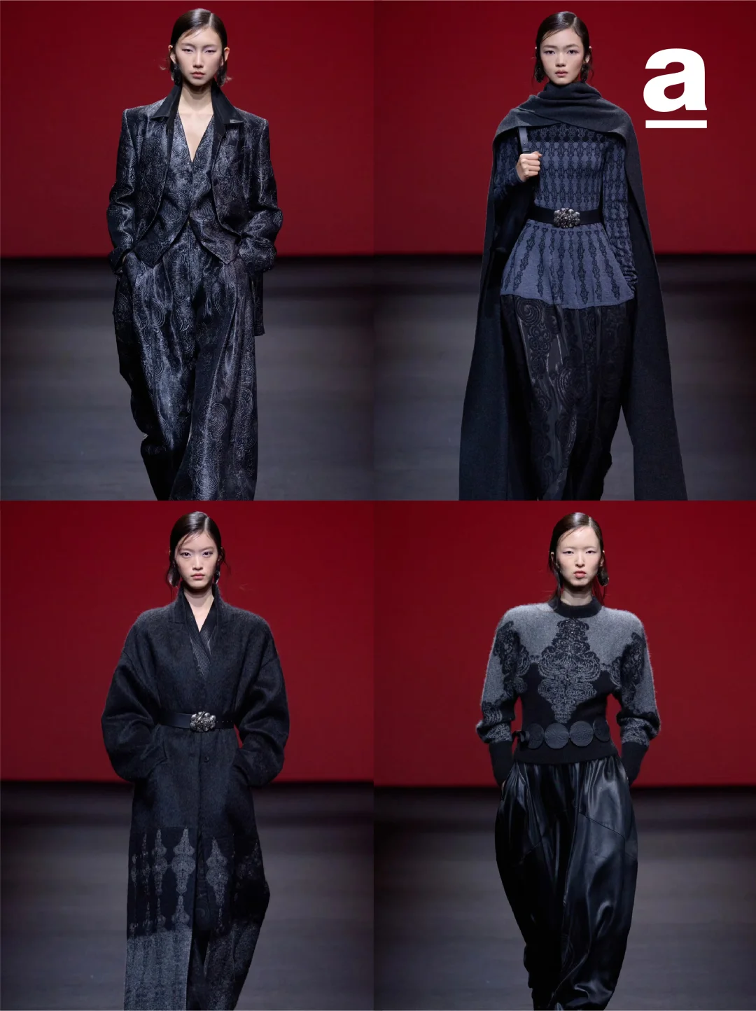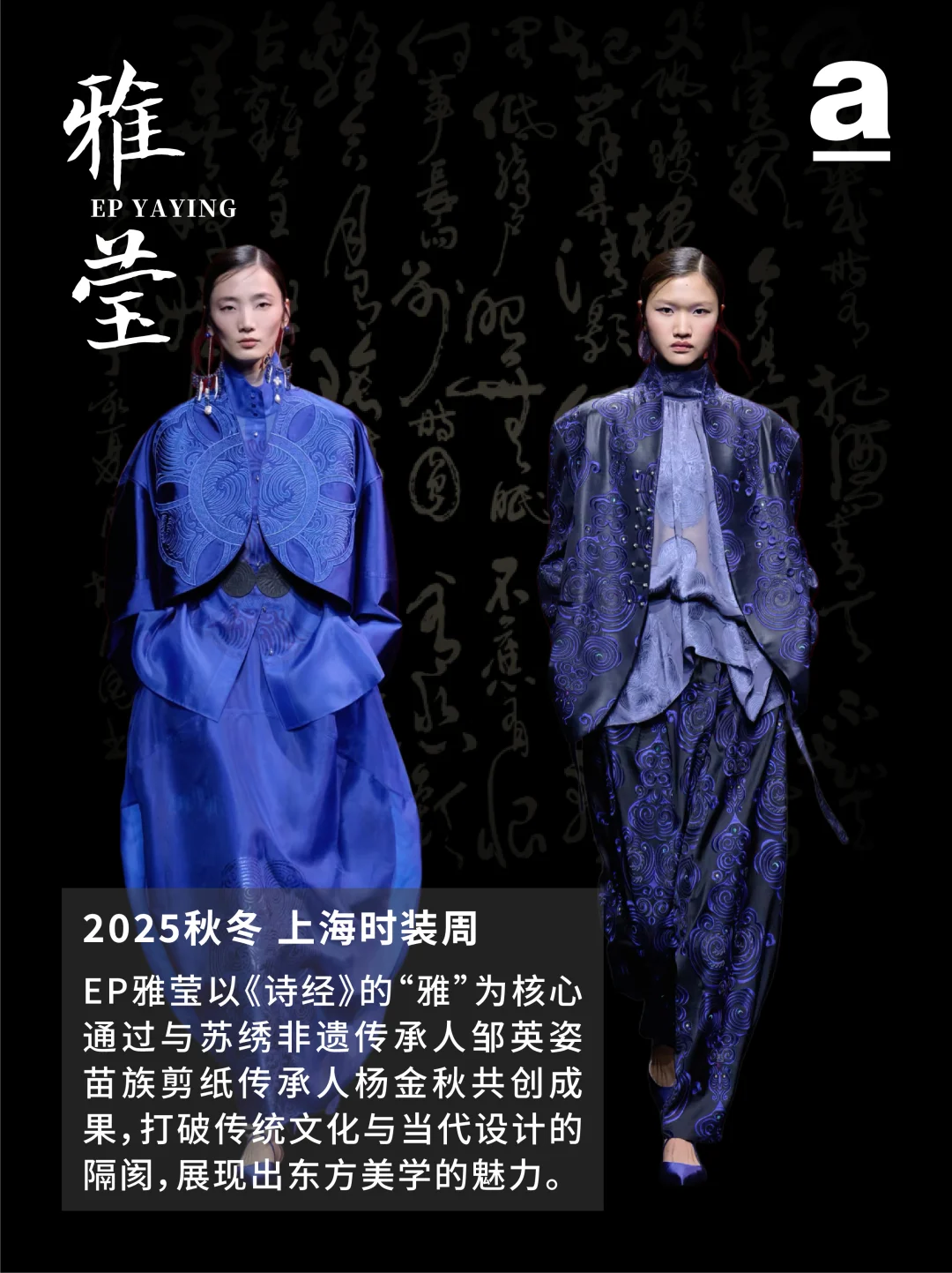 作为开场上海时装周的民族品牌,雅莹的“雅”系美学真的越品越有味道!以《诗经》的 “雅” 为核心,把牡丹、云肩、窗棂这些传统元素玩出了新花样。