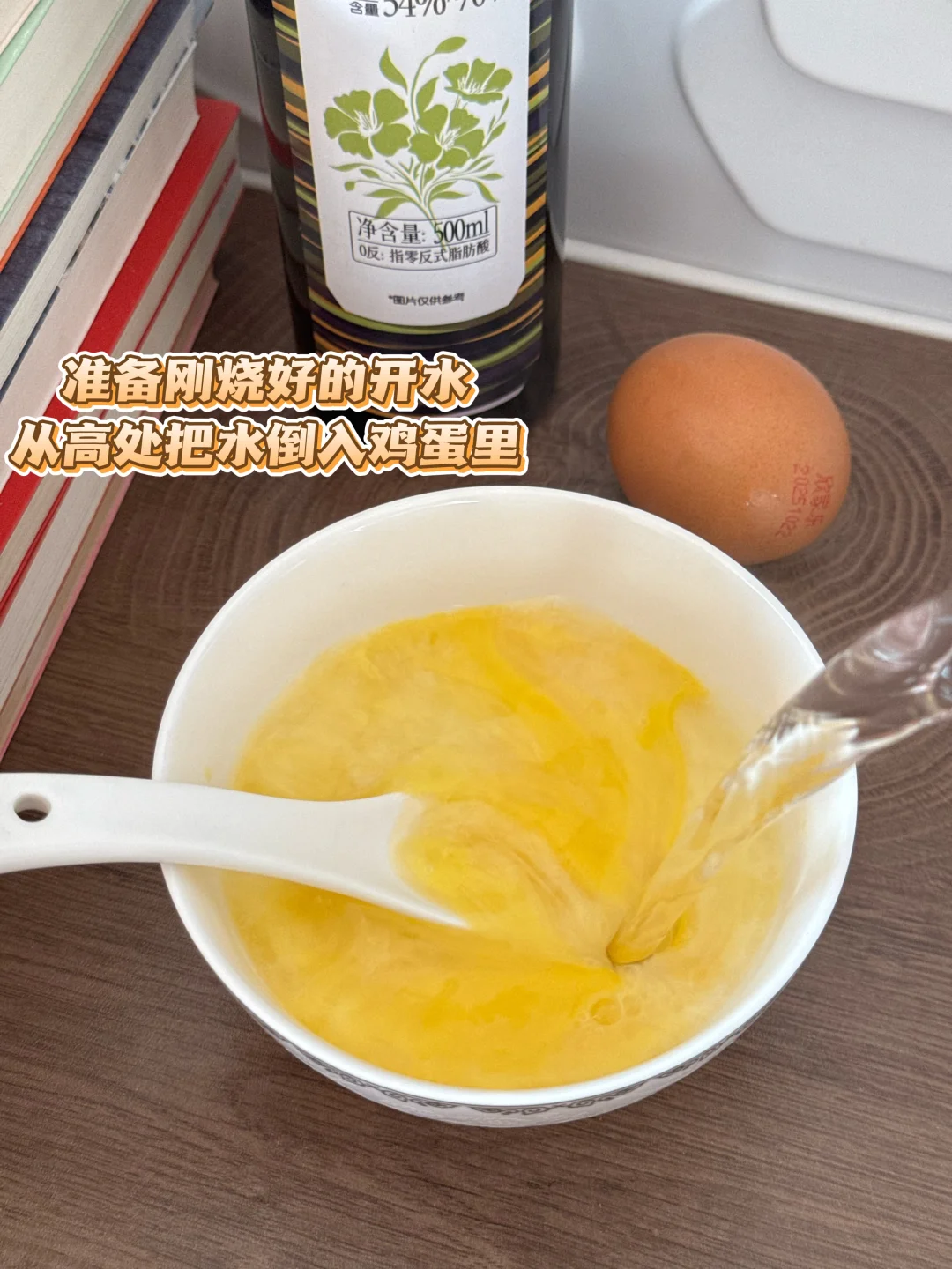 2️⃣烧一壶滚开的沸水(一定要100℃!)直接冲进去,边冲边搅,蛋液会瞬间变成细滑的蛋花;