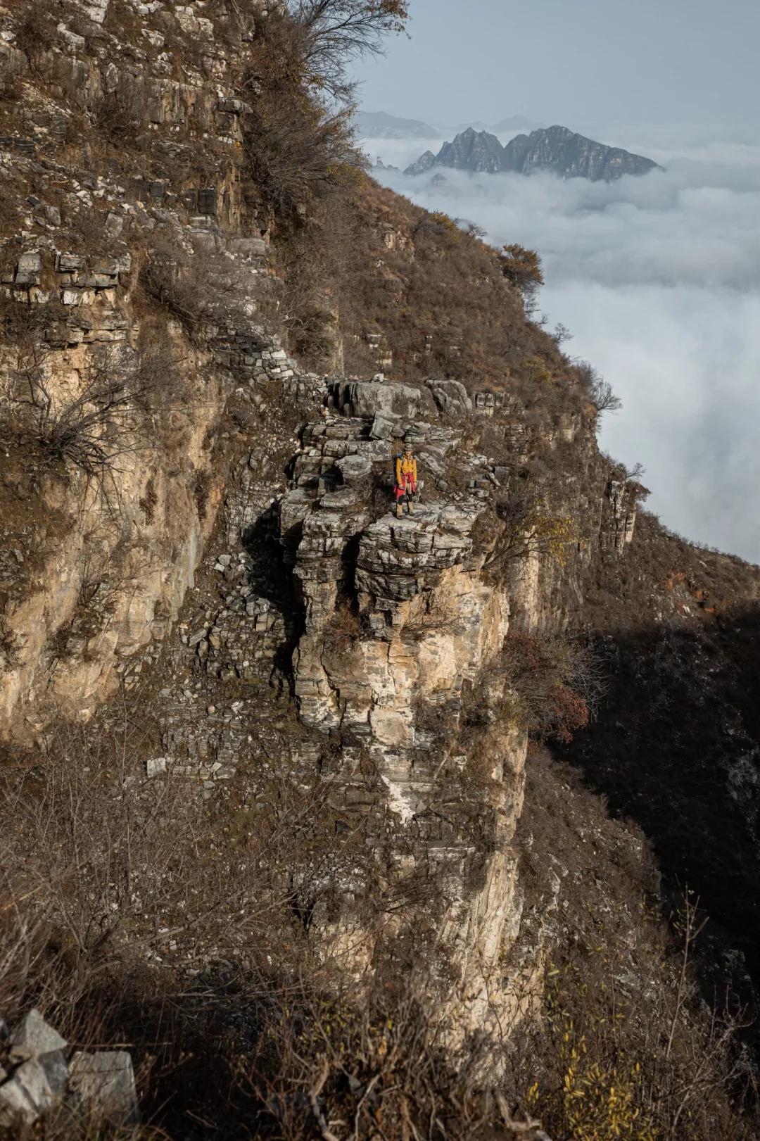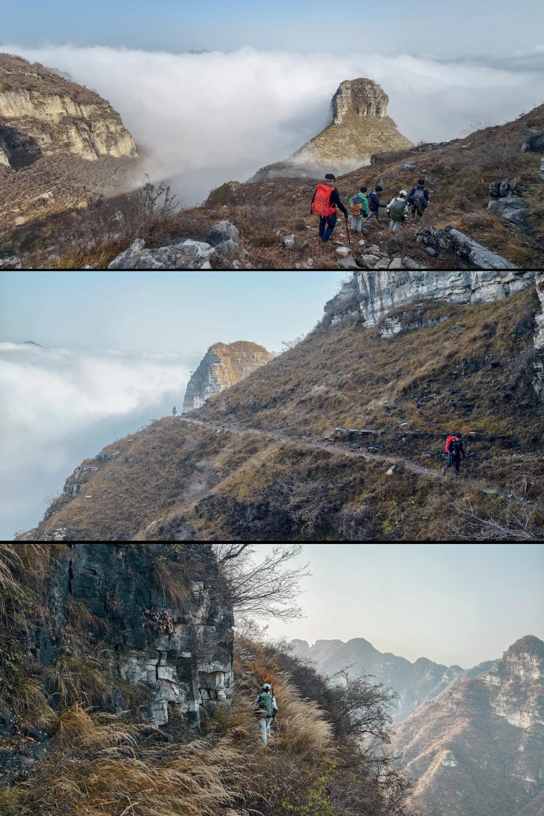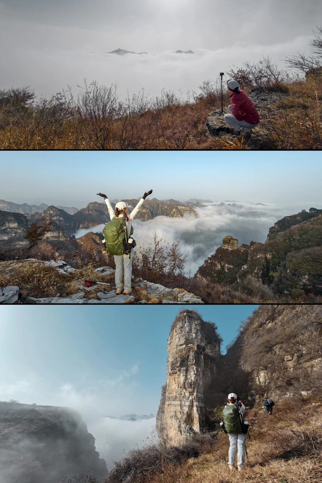 📍此路线不适合雨后走,土坡和崖边都容易打滑,难度和危险度都会增大;但任何事情都有两面性,前一天下雨第二天晴天,我们遇见了壮观的云海。涞水三顶所见群峰巍峨峥嵘,直插云霄,在浩瀚无垠的云海中时隐时现,我们宛如行走在天上人间。