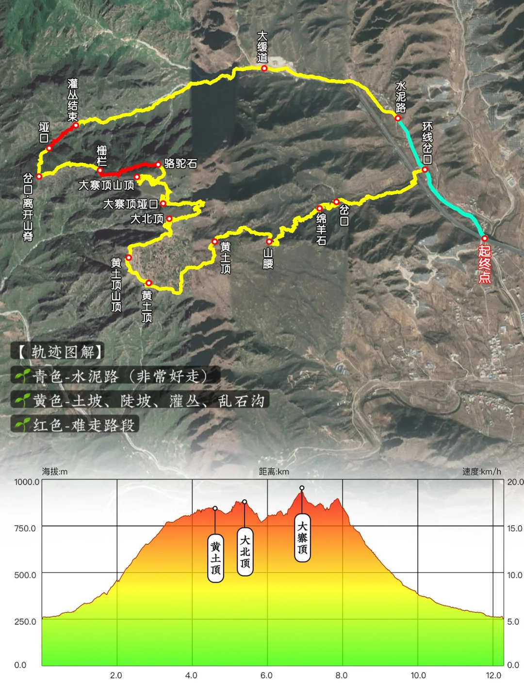 ❹黄土顶和大北顶都挺好上的,常规土路,就是路线丰富复杂,岔口很多,最好会使用轨迹;大寨顶不好上,本想按路网走不回头路,但东南方向实在不好上,就从东边走一个小折返,这段路径不清晰,草路纯趟