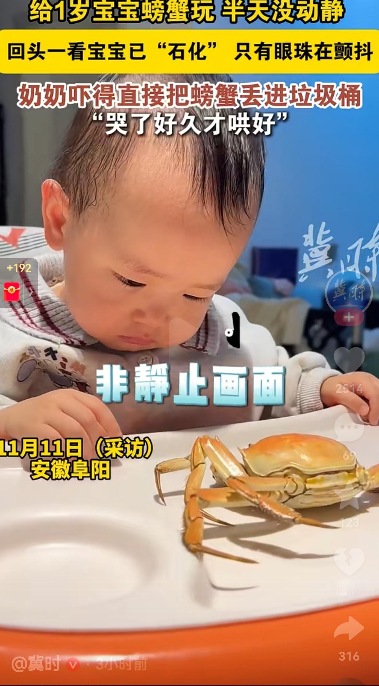 长长心吧!安徽阜阳,一女子给一岁宝宝一只螃蟹,让宝宝玩。平时活泼好动的宝宝,这次半天都没有动静,等家人回头一看,宝宝已经“石化”,坐在座椅上一动不动,只有眼珠在颤抖。 再看看宝宝的表情,小嘴一瘪,眼睛还有泪水,委屈极了,这一看就是吓坏了! 等奶奶看到宝宝的表情不对劲,意识到可能是螃蟹的原因,奶奶吓得直接将螃蟹扔进了垃圾桶。 这个时候宝宝才敢哭泣,搂着奶奶一直大声哭泣,哄了老半天,宝宝的情绪才渐渐平稳。 网友看到后评论说,我闺女小时候也是这个样子,螃蟹还活着, 琢磨着放地下爬让孩子玩玩,结果吓的直哆嗦哇哇哭。 还有的网友说,被硬控了!太可爱了!那嘴角撇得好乖!谁受得了这委屈巴巴的样子。 孩子太小了,对长相难看的东西有一种莫名地害怕,甚至有些恐惧。如果让孩子直接接触,未免对孩子的心理造成伤害,所以,家长还是长长心吧?关注孩子的心理健康,千万别给孩子造成伤害了! 大家觉得呢?欢迎大家评论区讨论留言。