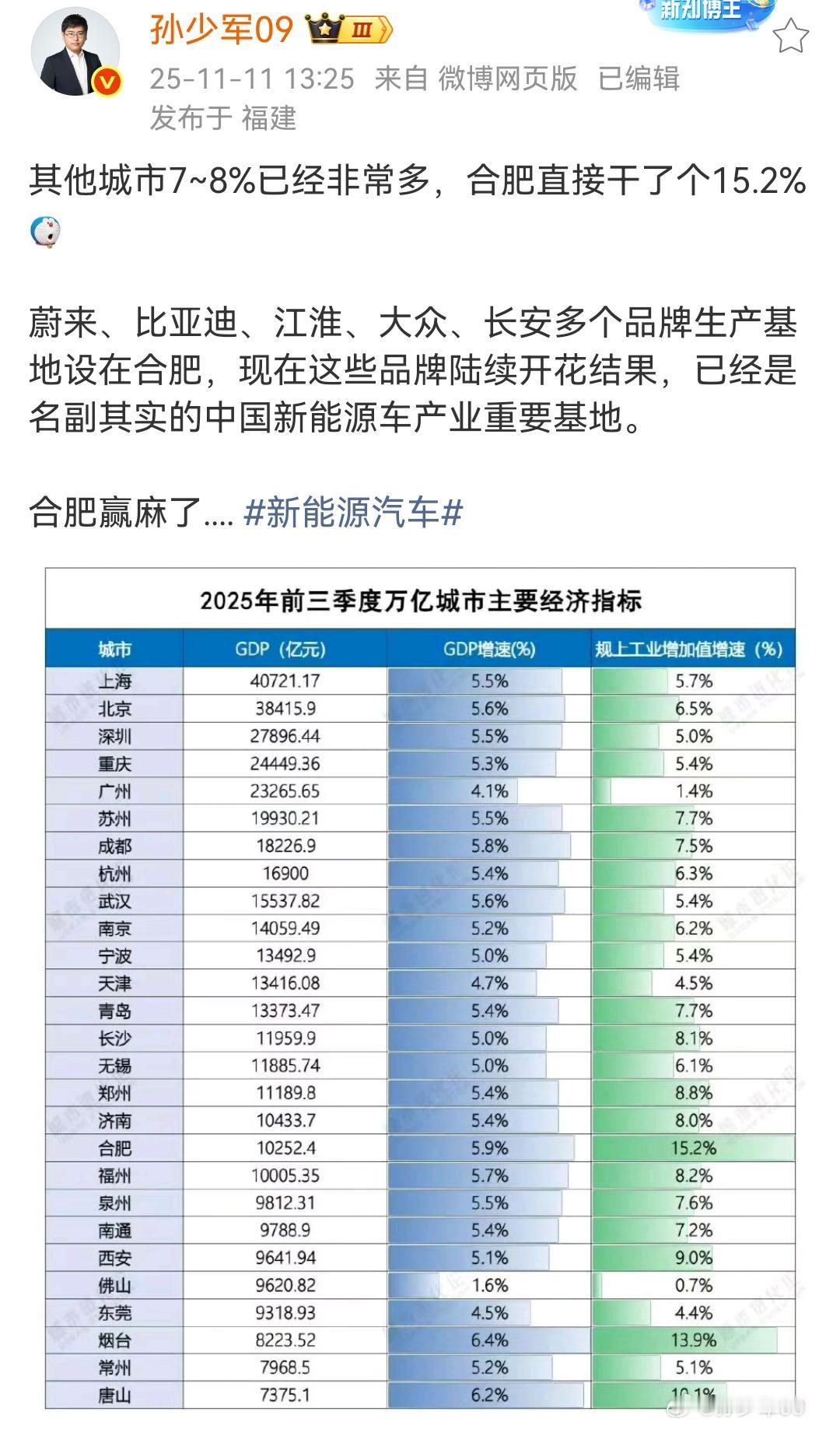孙少军:合肥赢麻了,其他城市7%~8%已经非常多了,合肥工业规模增加值直接干了15.2%! 合肥聚集了一大批规模以上工业,仅仅在汽车领域就有几家非常厉害的企业,比如说蔚来集团、江淮集团、比亚迪集团、长安集团等。 除了这些东西,合肥还有很多的高新产业,这是其他城市所不能比拟的,比如说国内的屏幕制造巨头京东方,芯片制造商长鑫存储,还拥有一大片白色家电产业。 各位是怎么看的?欢迎评论区留言。