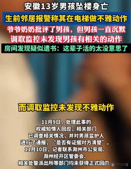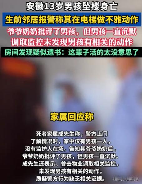 安徽滁州,13岁男孩在电梯里被指有不雅动作,小区居民不仅报了警,还在业主群称男孩是变态,民警没联系监护人,就单独找男孩了解情况,之后又告知男孩的爷爷奶奶,男孩遭民警谈话、家人批评后,从小区楼顶坠楼,男孩的父亲查看监控,并没有发现儿子有不雅动作,誓为儿子讨个说法。 成先生怎么也没想到,13岁的儿子小成会突然坠楼而亡,那天他接到消息赶回家,看到冰冷的儿子后,整个人都懵了。 原来,事发当天小区里有人传消息,说小成是男变态,在电梯门口有不雅动作,还报了警,这在业主群里,各种难听的话都有。 民警接到报警后,到了小成家,可他们没联系上监护人,就直接单独询问了小成,之后遇到小成的爷爷奶奶,就把情况说了一下,老人听后,也没细问,就又批评了小成。 小成本来就处于懵懂期,突然被这么多人指责,心里压力很大,民警的询问,家人的批评,让他不知该如何是好。 当晚,他就从小区楼顶,跳了下去。 成先生查看监控,根本没发现儿子有不雅动作。 他觉得这一切太荒唐了,儿子就这么不明不白地没了,他质疑民警的询问流程,觉得他们没谨慎对待未成年人。 成先生也对邻居的不实言论,提出质疑,没核实就传播谣言,害得儿子承受这么大压力。 他决心要为儿子讨个说法,让那些造谣儿子的人付出代价。 孩子本就脆弱,遇到这种事,心理防线很容易崩不住,邻居们没核实就传播谣言,民警没谨慎对待未成年人,都成了悲剧的推手。 民警单独询问13岁男孩,这已经涉嫌程序违法。 法律对未成年人有特殊保护,就是为了防止他们在遇到事情时受到不公正对待,在这件事里,民警的行为到底违反了哪些法律呢? 根据《未成年人保护法》规定,为保障未成年人合法权益,询问未成年人时,应当通知其父母或者其他监护人到场。 询问小成的民警,没联系监护人,就单独询问了小成,这明显违反上述规定,如果认定执法过错,民警需担责,还可能需要行政赔偿。 小成的父亲,有权质疑民警的询问流程,他可以投诉,要求对民警的行为进行调查处理,如果确实存在执法过错,成先生可以要求赔偿,包括精神损害赔偿等。 爆料的人捏造事实诽谤小成,也要承担一定的法律责任。 根据治安管理处罚法规定,公然侮辱他人或者捏造事实诽谤他人的,处五日以下拘留或者五百元以下罚款;情节较重的,处五日以上十日以下拘留,可以并处五百元以下罚款。 爆料人在业主群里传播不实言论,称小成是变态,这已经构成了捏造事实诽谤他人,如果成先生起诉他们,他们将面临行政处罚。 根据《民法典》第一千一百八十三条规定:侵害自然人人身权益造成严重精神损害的,被侵权人有权请求精神损害赔偿。 小成因不实言论坠楼,成先生有权要求爆料人赔偿精神损害等损失,这不仅是对小成的公道,也是对不实言论的警示。 有人说,民警当时可能也是为了尽快了解情况,才单独询问小成,民警出发点是好的,不应该承担这么大责任。 但法律就是法律,它规定了询问未成年人必须通知监护人到场,这是为了保护未成年人的合法权益。 民警没做到这一点,就是违反了法律,必须承担相应责任。 有人觉得,爆料人只是说说而已,没想到会造成这么严重后果。不应该承担这么大责任。 不管主观上怎么想的,只要实施了违法行为,就要承担法律责任,爆料人捏造事实诽谤小成,对小成造成了伤害,必须承担行政和民事赔偿责任。 如果最终认定民警单独询问未成年人程序违法,应对涉事民警进行处理,并赔偿成先生一定损失。 爆料人因诽谤小成,也应该被行政处罚,并赔偿成先生精神损害等损失。