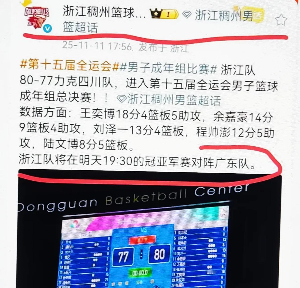 浙江击败四川,提前进入本届全运男篮决赛,俱乐部高兴之余,发文道:……明晚冠亚军对阵广东队。 低调点,你让辽宁队情何以堪,广东辽宁还没打呢。 回头来看,广东和浙江所在的第二小组才是真正的死亡之组,四支球队,有两支冠亚军,噢,又言之尚早一点。