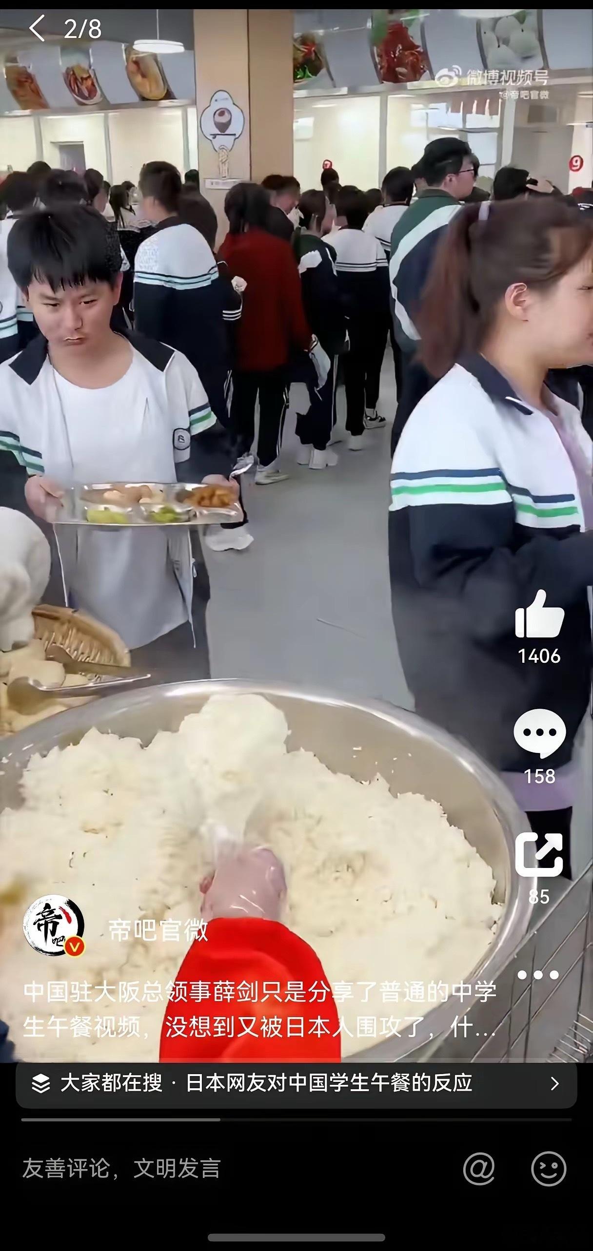 中国驻大阪总领事薛剑只是分享了一下普通公立中学午餐打饭的视频,就被本子网民围攻了,假的,摆拍,私立贵族学校之类的言语充斥着评论区。