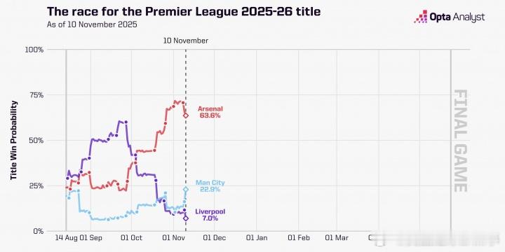 Opta更新英超本赛季争冠概率走势:阿森纳目前63.6%领跑,曼城22.9%暂列第二,利物浦从赛季初被看好跌到目前的7%