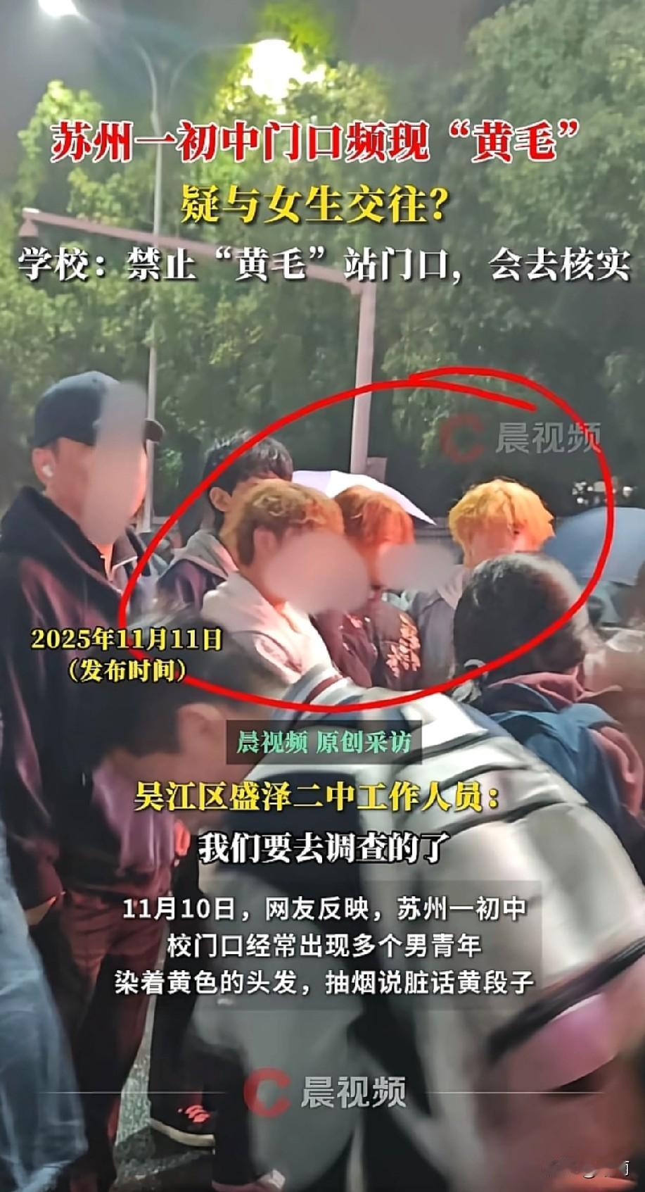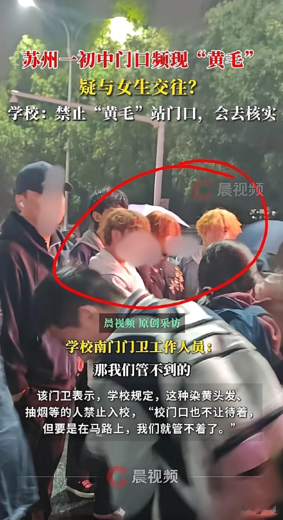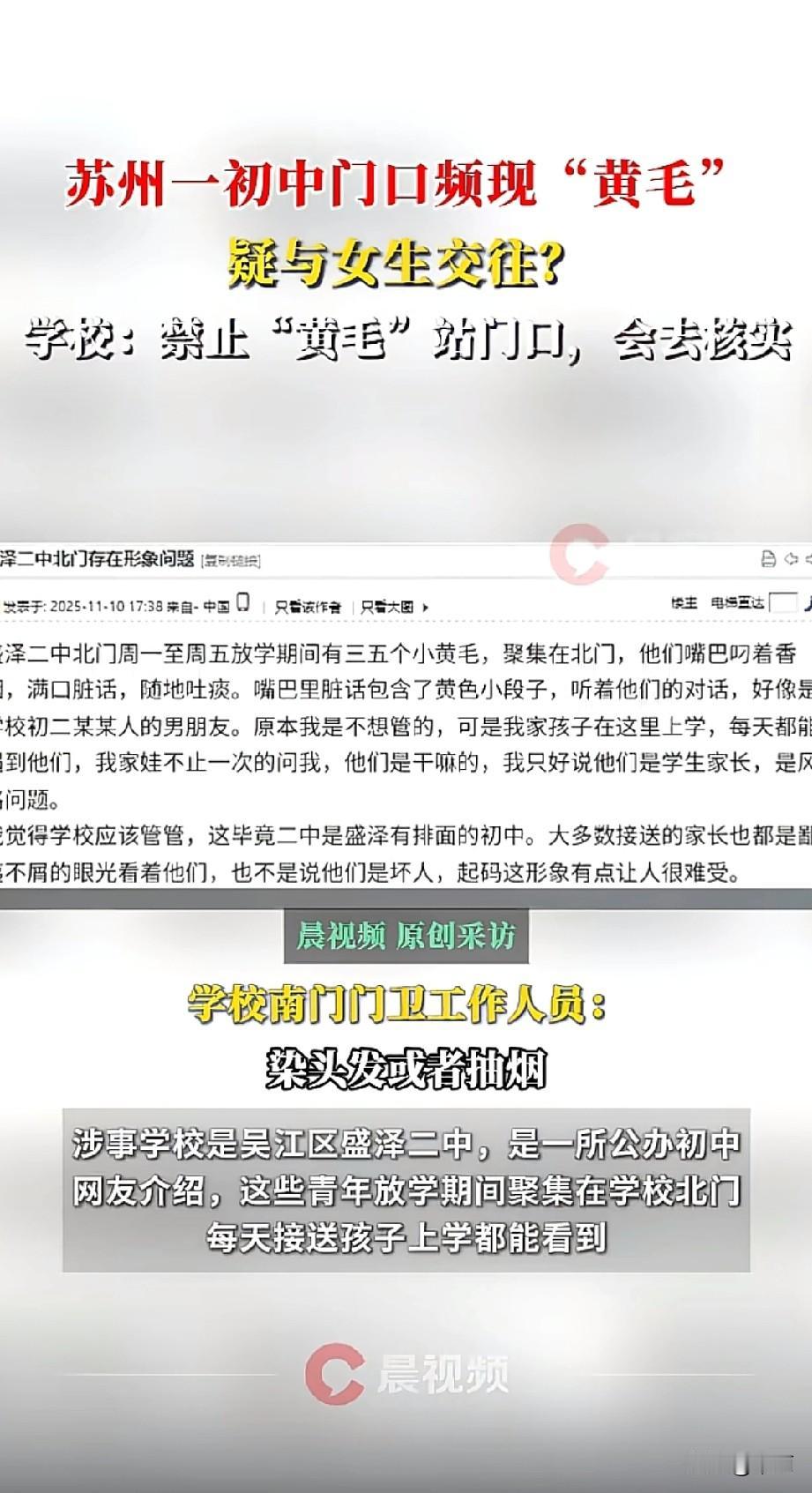 11月10日有家长爆料,苏州吴江区盛泽二中北门,放学时总有名染黄发的男青年聚集,抽烟说脏话还飙黄段子,听对话疑似该校初二女生的朋友。家长们担心带坏孩子,盼着能有人管管。 11号学校回应会核实调查,还说校内和校门口不让这类人逗留,但他们站在马路边,学校没管理权。 其实校园周边不是学校一方能管好的,这事儿得公安、社区和学校联动才行。未成年人成长环境得靠大家守护,马路不能成监管真空带,希望相关部门赶紧补位,让校门口变回干净安全的地方。