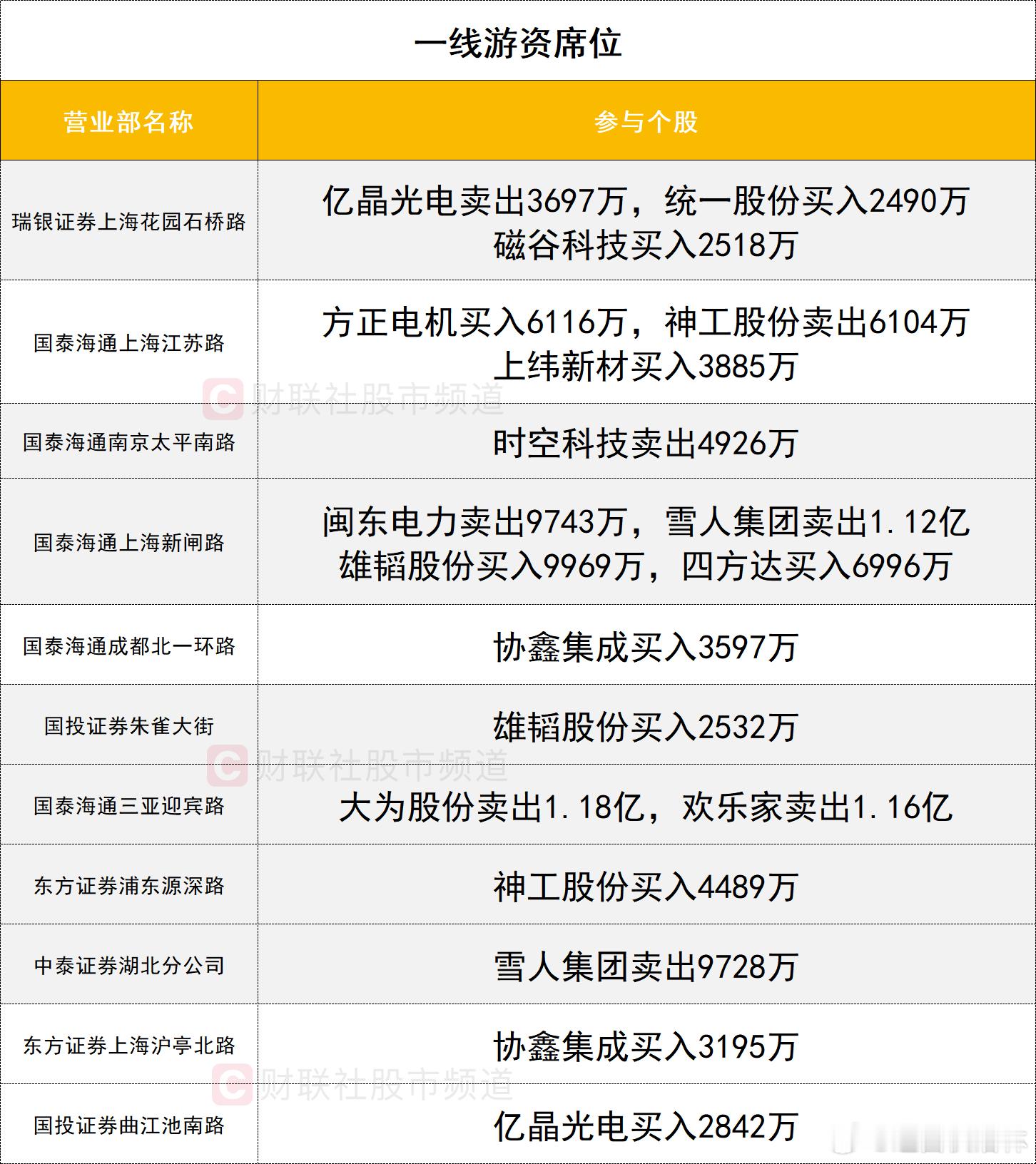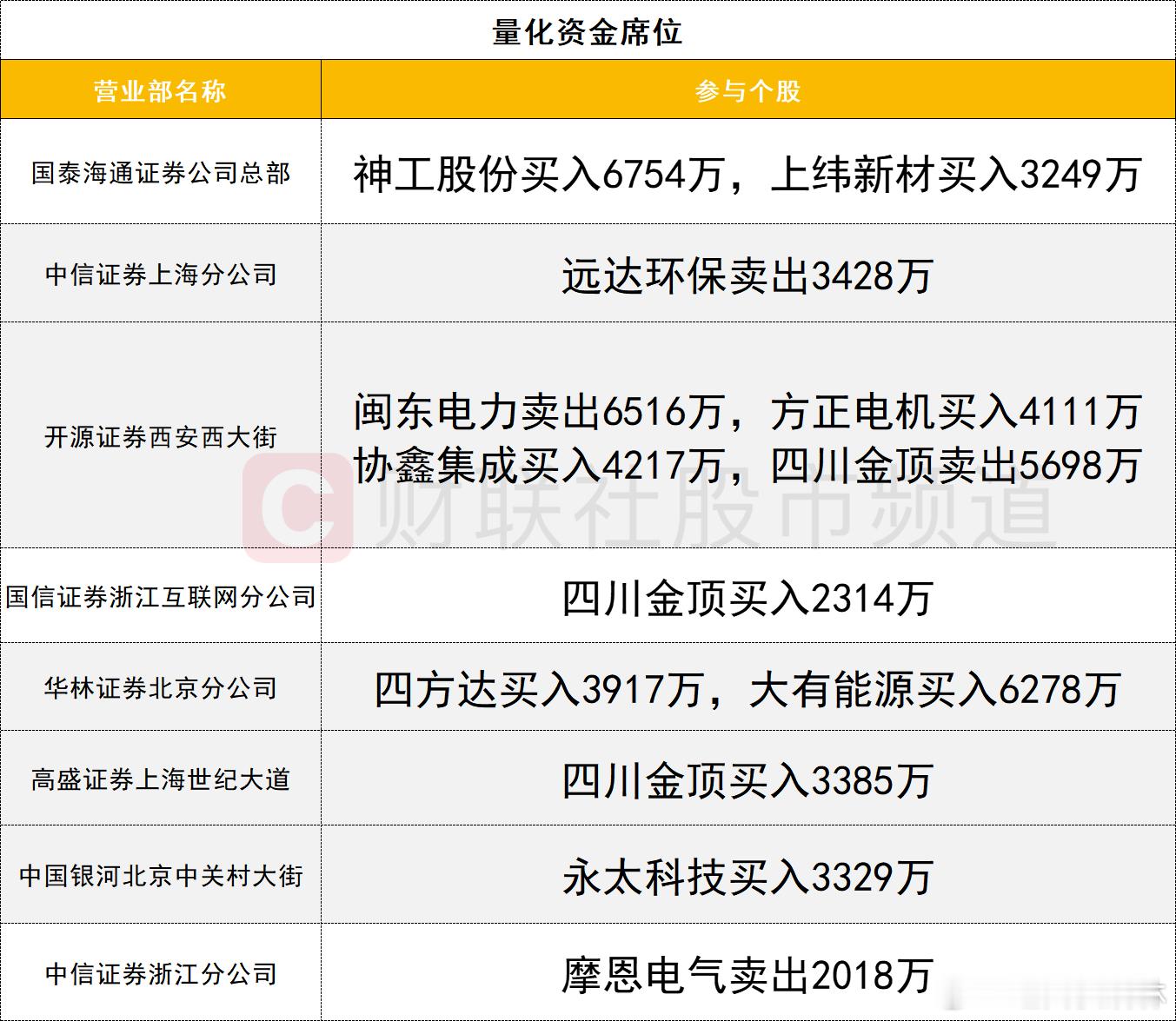 龙虎榜1、机构龙虎榜机构活跃度较高,买入方面,四方达今日20cm涨停,获三家机构买入1.13亿。六连板的摩恩电气反复开板,获三家机构买入9562万,同时遭一家机构卖出1333万。存储芯片概念今日冲高回落,时空科技获一家机构买入1.31亿,同时遭一家机构卖出7097万。卖出方面,大为股份冲板回落,遭三家机构卖出7629万。芳源股份遭一家机构卖出9660万。2、游资一线游资活跃度较高,四方达获一家一线游资(国泰海通证券上海新闸路)买入6996万。大为股份、欢乐家遭国泰海通证券三亚迎宾路席位分别卖出1.18亿、1.16亿。雪人集团遭两家一线游资席位合计卖出2.09亿。量化资金活跃度有所降低,四川金顶获两家量化席位买入5699万,同时遭一家量化席位卖出5698万。四方达获一家量化席位买入3917万。