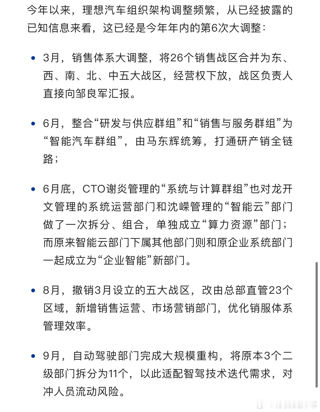 36kr: 李想直管人事,华为系高管淡出理想管理层。 ————————一见Auto:今年以来,理想汽车组织架构调整频繁,从已经披露的已知信息来看,这已经是今年年内的第6次大调整:3月,销售体系大调整,将26个销售战区合并为东、西、南、北、中五大战区,经营权下放,战区负责人直接向邹良军汇报。6月,整合“研发与供应群组”和“销售与服务群组”为“智能汽车群组”,由马东辉统筹,打通研产销全链路;6月底,CTO谢炎管理的“系统与计算群组”也对龙开文管理的系统运营部门和沈嵘管理的“智能云”部门做了一次拆分、组合,单独成立“算力资源”部门;而原来智能云部门下属其他部门则和原企业系统部门一起成立为“企业智能”新部门。8月,撤销3月设立的五大战区,改由总部直管23个区域,新增销售运营、市场营销部门,优化销服体系管理效率。9月,自动驾驶部门完成大规模重构,将原本3个二级部门拆分为11个,以此适配智驾技术迭代需求,对冲人员流动风险。