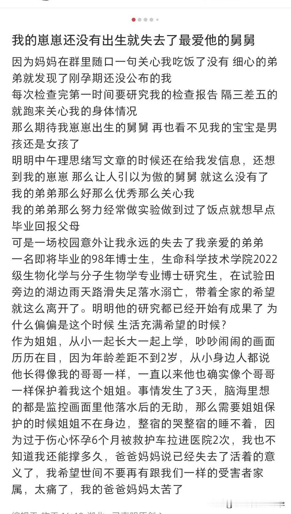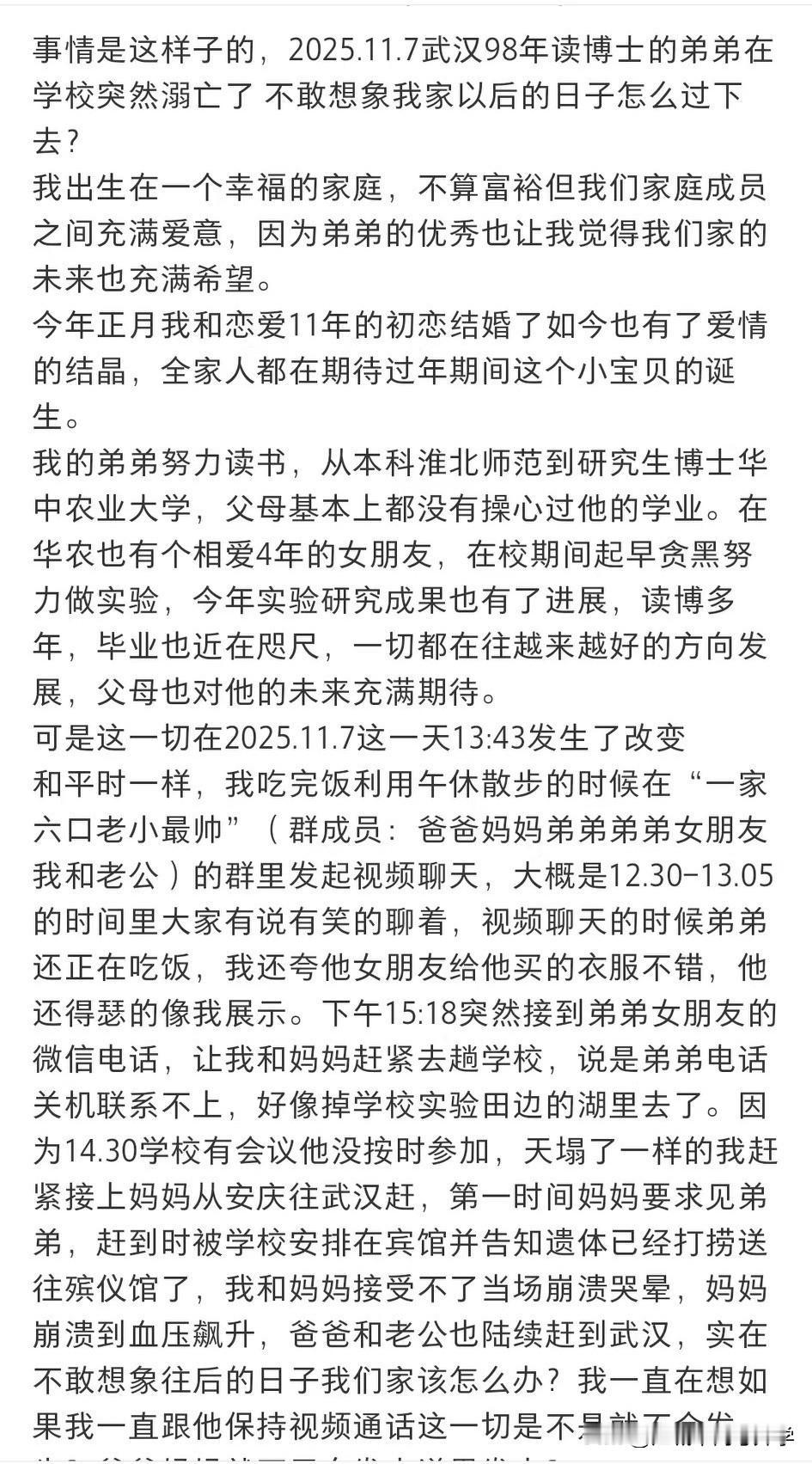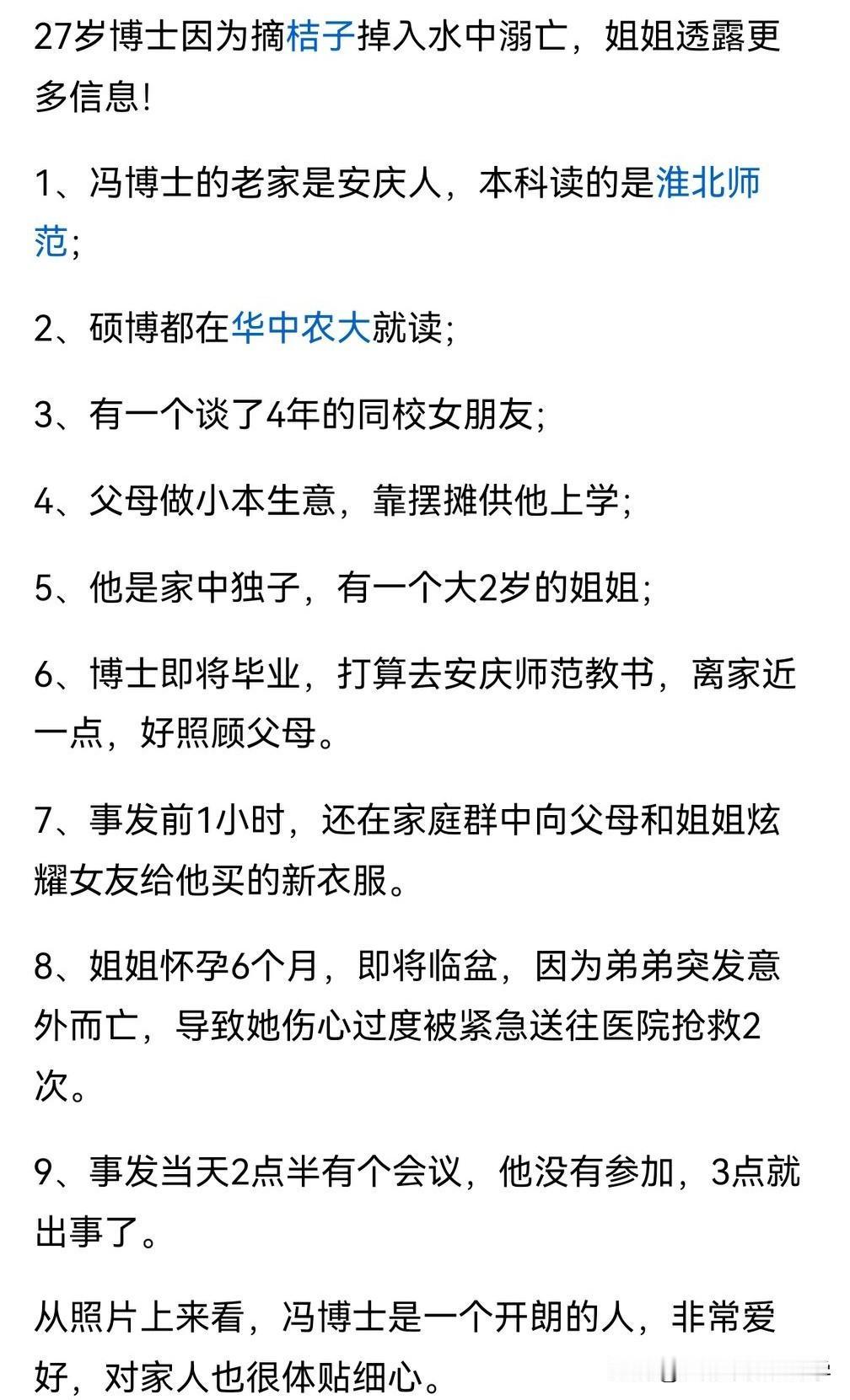 华农溺亡的博士亲姐姐透露了更多细节, 一个27岁即将毕业的博士, 本来有一个很好的未来和光明的前途, 工作都已经敲定,即将毕业了就去就业。 也有一个幸福的家庭, 有一个普通的家庭,很爱他的父母 有一个大他2岁即将临盆的姐姐, 一个关系很稳定的同校女朋友, 可这一切都因为一场意外戛然而止。 人生就是这么无常, 前一秒还与家人谈笑风生, 后一秒就天人永隔, 真是天妒英才,可惜实在是可惜。