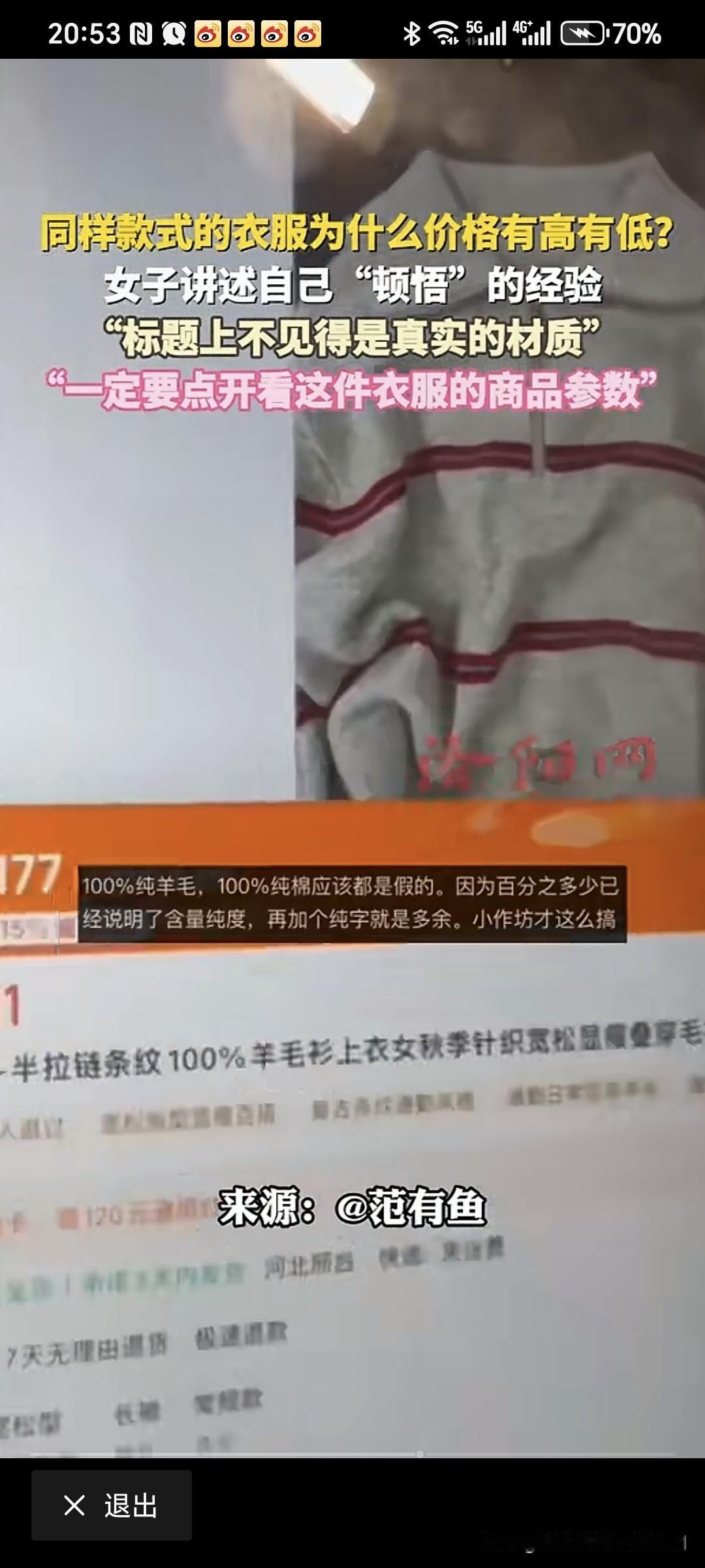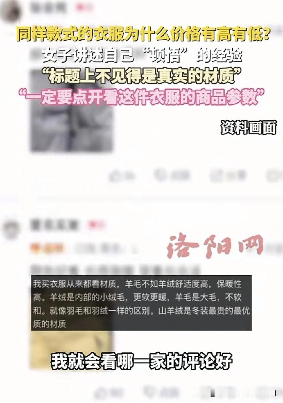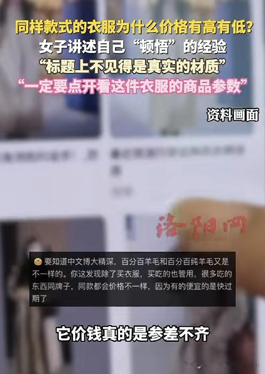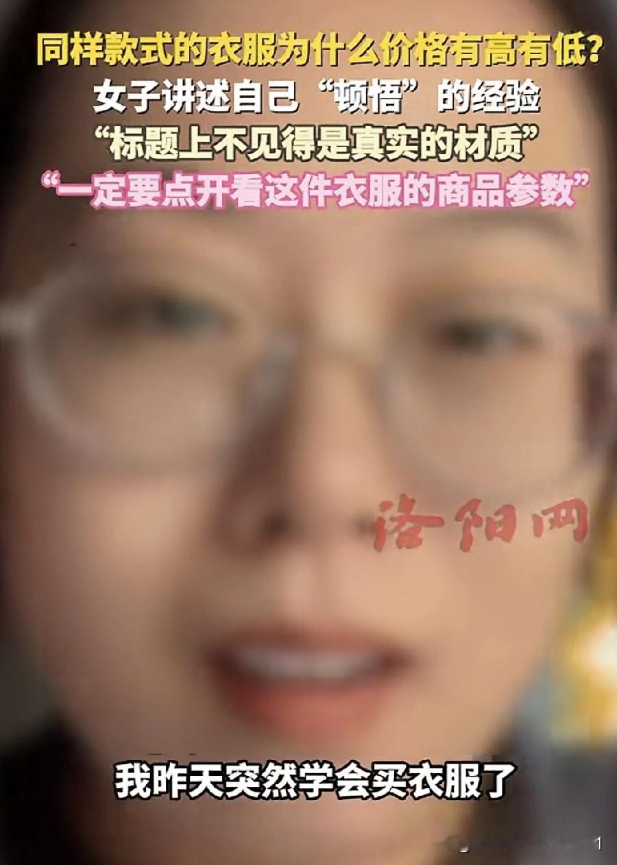 女子发视频表示自己三十多岁了,昨晚突然开窍会买衣服了。 女子休息时刷手机,在网上看到一件毛衣的图片特别好看,便上网搜索同款。搜出来后,发现价格参差不齐,她心想:这看起来没什么不一样,咋差价这么大呢?以前买同样的衣服,女子会看哪家评论好就在哪家下单。但昨晚不知怎的,她脑子突然灵光一闪,点开商品链接最下方的商品参数界面,这下能清楚知道衣服的面料了。原来,材质越好,衣服越贵,这说明是真材实料。女子恍然大悟,标题上标注的不见得是真材料,得点开商品参数才能看清。 女子像发现新大陆似的,发视频问网友,是只有她不会看,还是大家都会呢? 一分钱一分货,只有错买没有错卖,便宜没好货,这是实话。反正都有运费险,我的做法就是把衣服都买回来对比,哪个好留哪个,剩下的都退掉。不过,有时也发现好几次不同店家的发货地都是同一个。