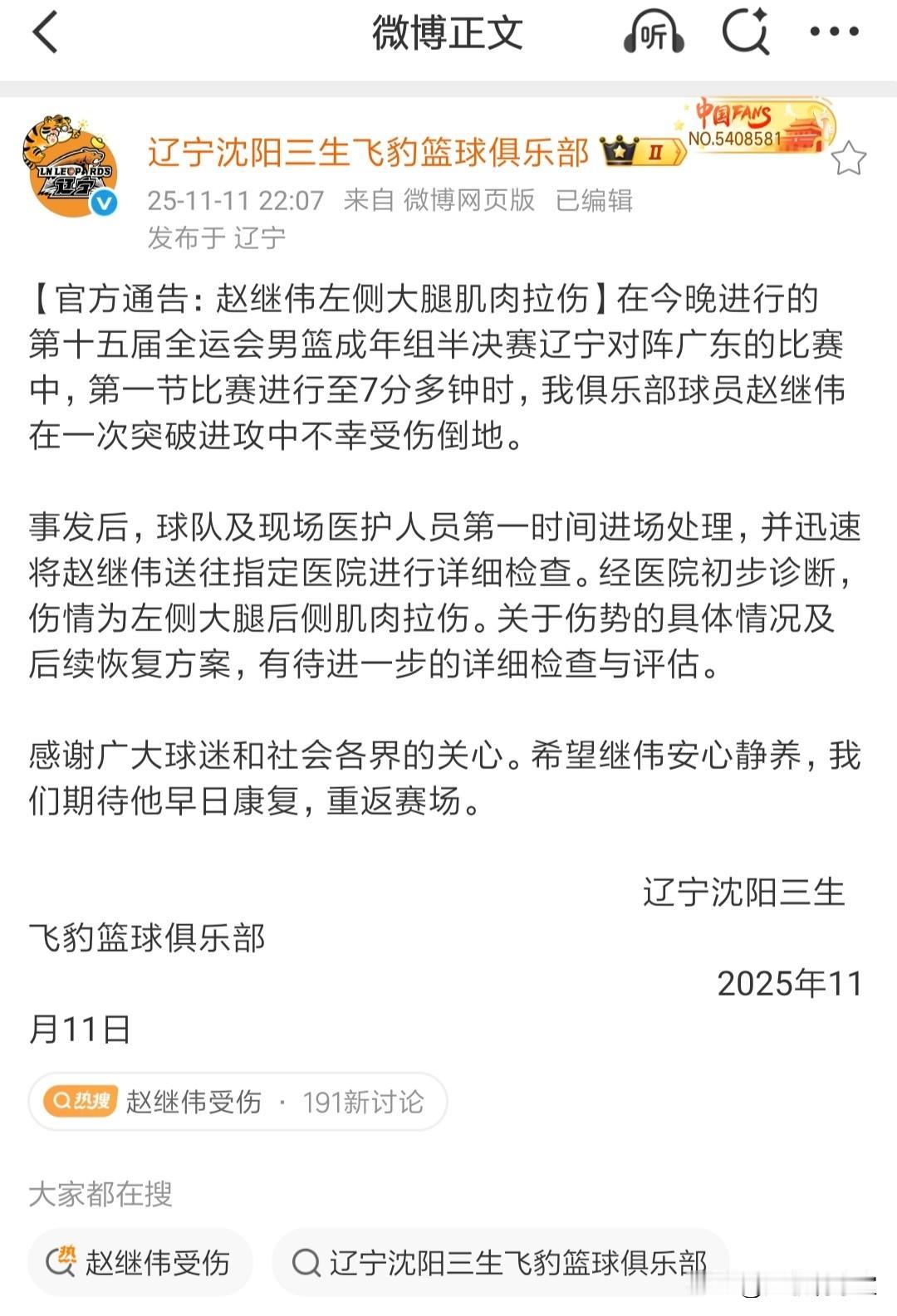 赵继伟在半决赛对广东的比赛过程中突发意外,不幸受伤倒地,经初步诊断为大腿肌肉拉伤。让我说,赵继伟的这次受伤不是偶然,赵睿在一次突破中也疑似崴脚受伤,很明显是全运会组委会对赛程的安排有问题,一日一赛对球员的体能消耗过大,身体过度疲劳就容易受伤,归根结底还是篮协为了让中国男篮球员有足够多的时间备战世预赛惹的祸,篮协方面肯定是希望全运会男篮比赛早点结束,让参加全运会的这些国家队的队员可以早点参加集训,不过做法矫枉过正,好心办坏事,太密集的赛程容易给球员带来伤病,得不偿失!