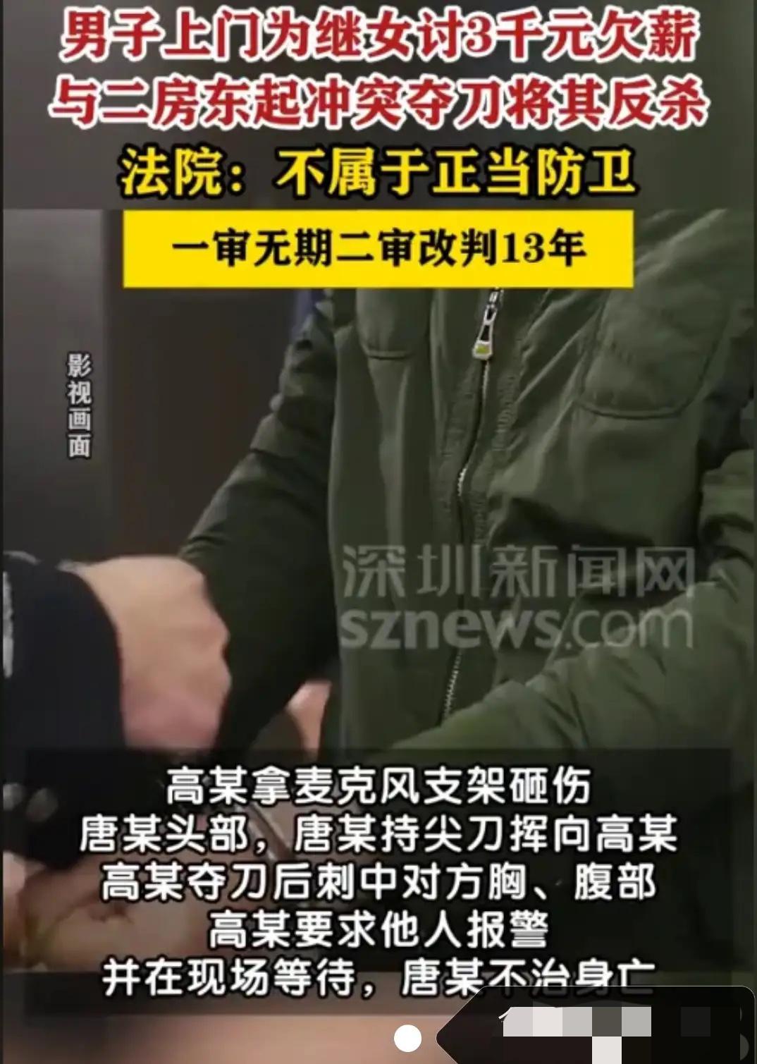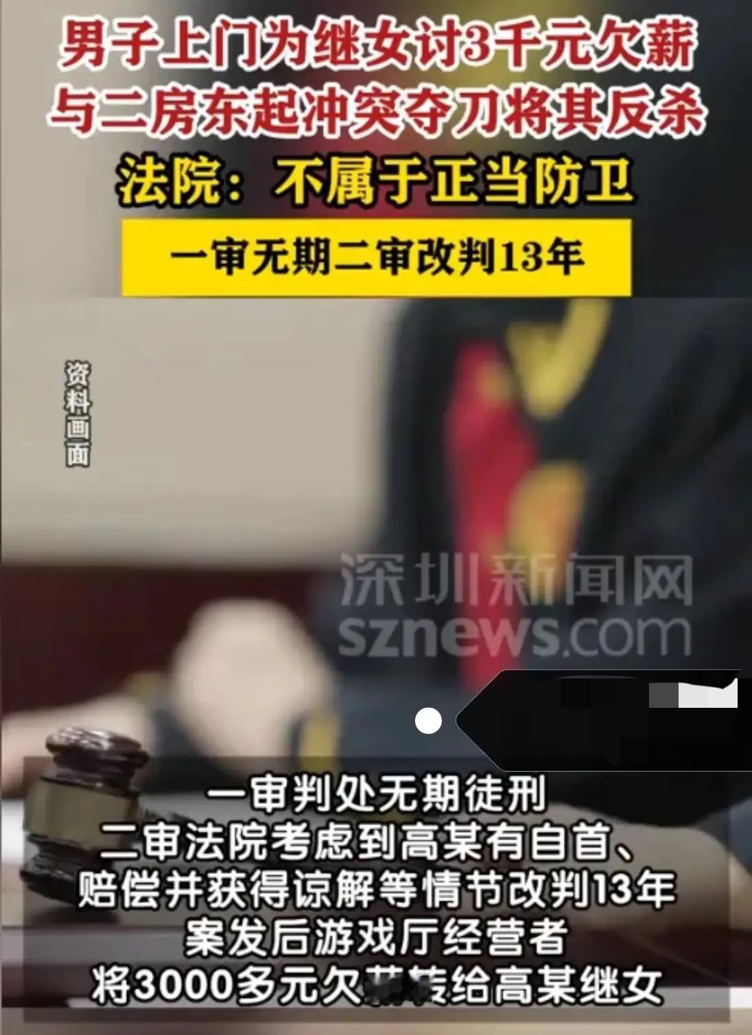 悲剧还是发生了!!! 河南鹤壁,一女孩在游戏厅打工1个多月,被拖欠了3200元的工资。女孩向继父哭诉后,继父气得到游戏厅找老板讨说法,期间二人发生肢体冲突。男子先用麦克风支架砸伤了老板的头部,随后老板持刀挥刺反击,在二人争斗期间,继父抢过老板的刀捅向老板致其死亡。 一审法院认定男子构成故意伤害罪,判无期。男子不服,认为自己是正当防卫,于是提起上诉。二审判了! 二审法院审理后,驳回了“正当防卫”的主张。法官认为男子先动手砸人,引发冲突升级,不符合防卫的正当性前提。 但法院也考量了案发诱因是欠薪,老板持刀反击存在过错,且男子事后自首、认罪态度良好,最终改判有期徒刑15年。 3200元的欠薪,换来一条人命和15年牢狱,两个家庭就此破碎。女孩既没了完整的家,还背负着沉重的心理负担。 网友议论纷纷,有人说继父太冲动,遇事该走法律途径;也有人替他不值,觉得讨薪被欠还落得这般下场。 游戏厅老板的家人沉浸在悲痛中,男子的家庭也没了经济支柱。这场闹剧没有赢家,只留下无尽的悔恨和警示——冲动是魔鬼,维权需理性。