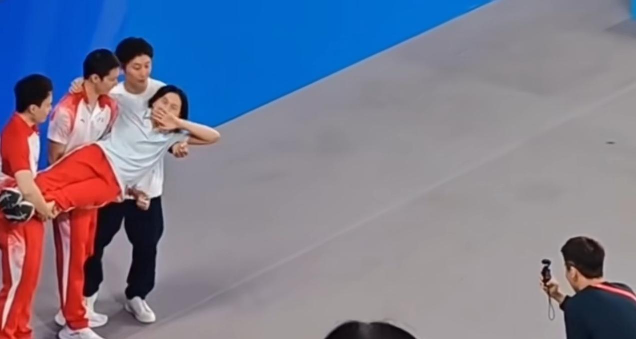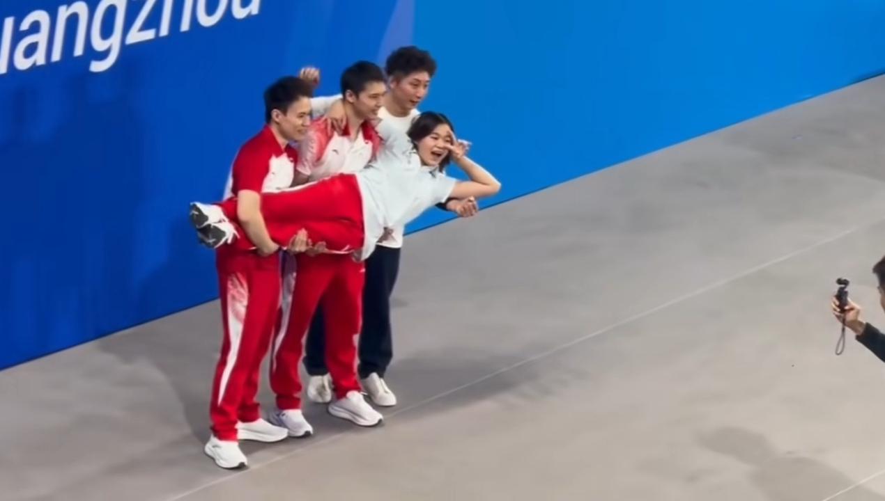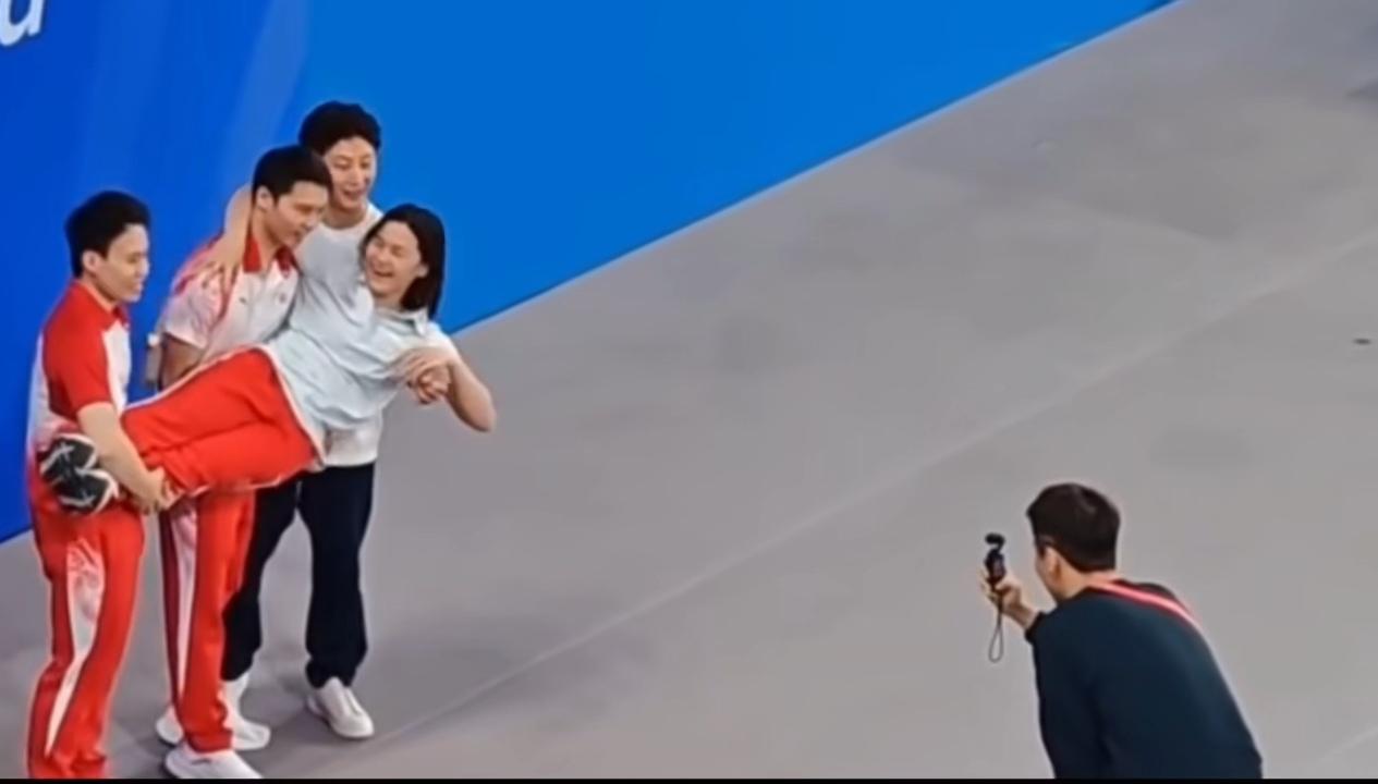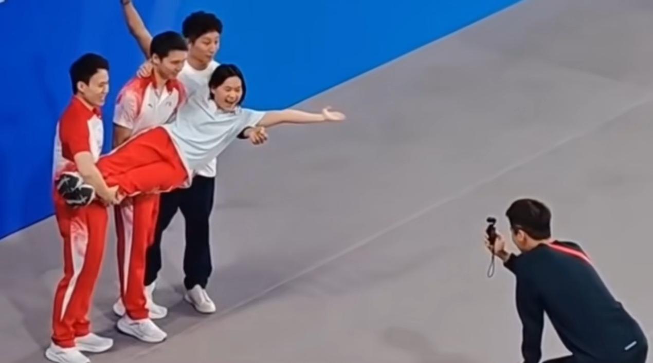 全红婵被抱起合照 她实在太可爱了 相信只有她才敢这么玩