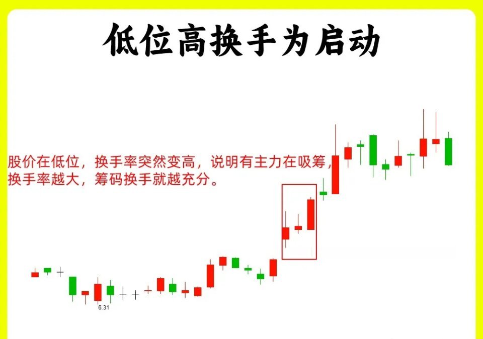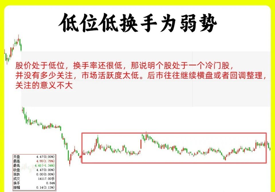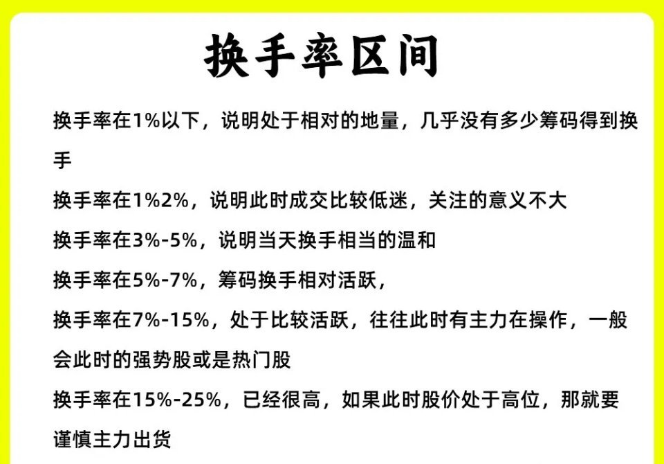 注意了!大部分技术指标都有一定的滞后性,唯独成交量和换手率不会,能立马能体现力量情况。那是因为这两个指标都是用资金堆积出来的。这两个指标正好是相辅相成,成交量大家都不陌生,今天我就来分享一下换手率,市场上有一句俗语,炒股不看换手率,再炒十年也枉然。可想而知换手率在一些高手眼里是多么重要还是老规矩,点赞收藏或评论666支持一下,我每天分享炒股干货,以免以后想温习找不到了换手率的数值代表着什么呢?我们简单可以这样认为,个股的市值把他比做100%,那此时有5%的筹码今天被换手,那今天换手率就是5%,现在知道了把我们把换手率大小,来判断个股的强弱,我们可以分成六种换手率在1%以下,说明处于相对的地量,几乎没有多少筹码得到换手换手率在1%2%,说明此时成交比较低迷,关注的意义不大换手率在3%-5%,说明当天换手相当的温和换手率在5%-7%,筹码换手相对活跃,换手率在7%-15%,处于比较活跃,往往此时有主力在操作,一般会此时的强势股或是热门股换手率在15%-25%,已经很高,如果此时股价处于高位,那就要谨慎主力出货一、低位低换手为弱势股价处于低位,换手率还很低,那说明个股处于一个冷门股,并没有多少关注,市场活跃度太低。后市往往继续横盘或者回调整理,关注的意义不大二、低位高换手为启动股价在低位,换手率突然变高,说明有主力在吸筹,换手率越大,筹码换手就越充分。三、高位低换手为锁仓股价在一轮上涨中继,处于上涨趋势当中,此时换手率很低,说明主力已经开始锁仓,市场的筹码流通都是散户在卖出,主力已经控盘四、高位高换手为出货股价经过长时间的上涨以后,处于一个高位,此时的换手率也很高,比如换手率大于20%,当然了大盘蓝筹和中小盘股的比值肯定是不同的,如果大蓝筹可能是15%,就算已经很高了。那就说明此时主力在出货,高位派发筹码好了!以上就是今天的全部内容,六种换手率区间的划分和四种常见换手率表现,你记住了吗?希望这期内容对你有帮助或者启发