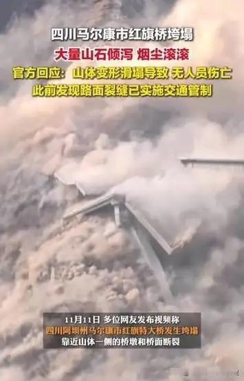 四川马尔康红旗特大桥垮塌:预警机制筑牢生命防线 11月11日,四川省阿坝州马尔康市双江口水电站红旗特大桥因山体滑坡发生垮塌,桥体坠入足木足河,现场烟尘弥漫。所幸,因10日巡查发现桥头路面及边坡裂缝后,当地交通部门立即实施临时管制,禁止车辆通行,事故未造成人员伤亡。 此次成功避险表明,日常巡查、隐患排查与快速响应机制的结合,是防范地质灾害风险的有效路径。
