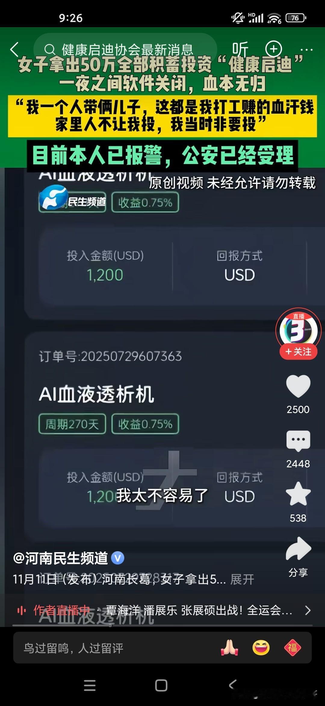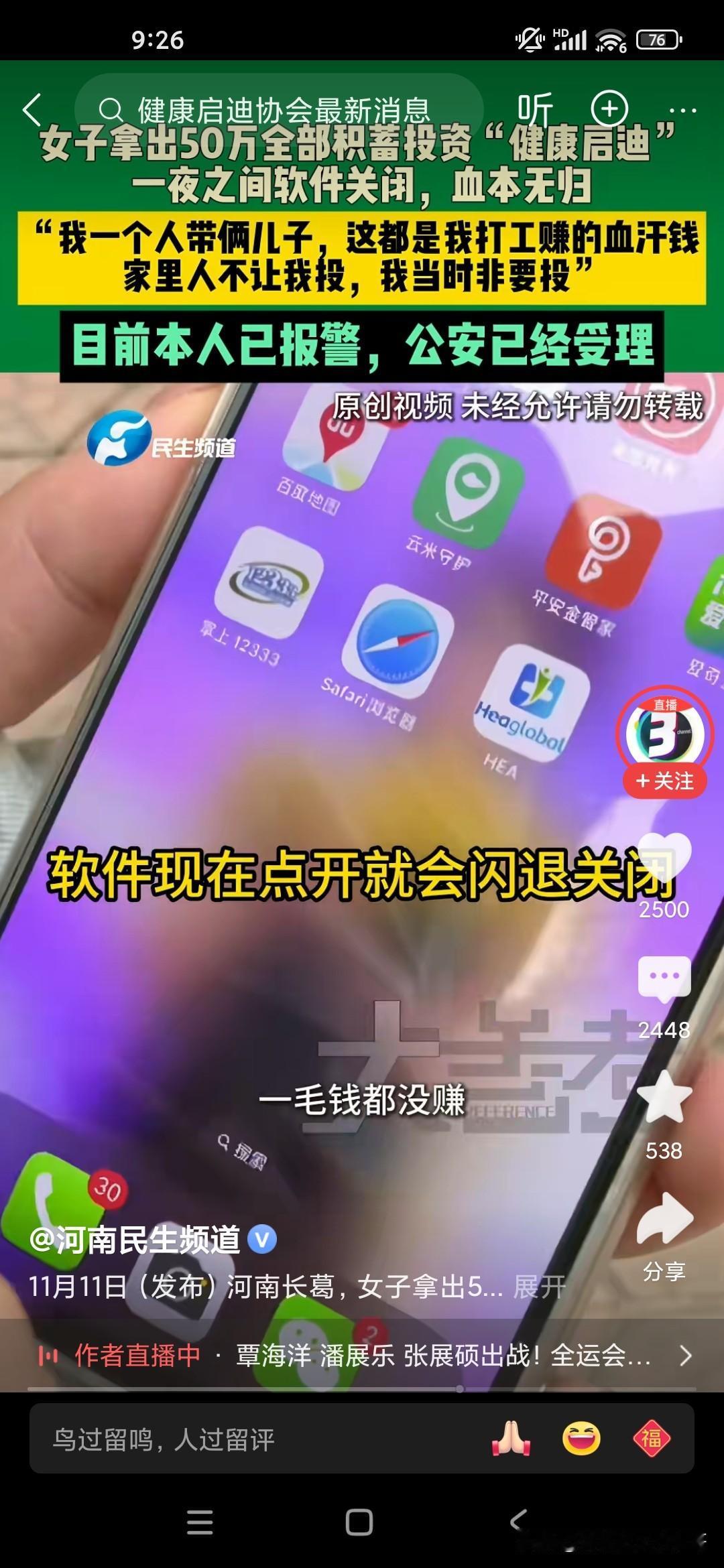 我的这位老乡被丈夫离婚是有道理的,就是因为她太贪婪了,又不是专业投资人士,就这样一款医疗器械APP就轻易把她给欺骗了,本来离婚了五十万还可以帮她度过后半生,结果全部打水漂了,怨谁呢?家人劝都劝不住,钱在她自己手里,谁也劝不住啊,最后全部投资失败,APP都打不开了,你叫了记者也帮不了你啊,只能说自己太愚蠢,太想赚大钱了,其实很多人是驾驭不了财富的,是不能有钱的!一旦有钱就被老天收走了!她很可怜,也很可恨!