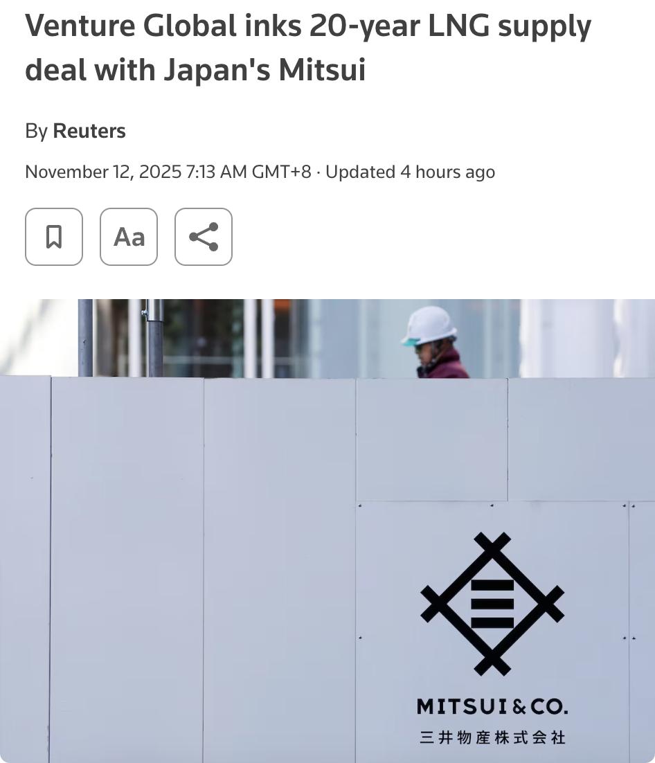 外媒:美国液化天然气(LNG)供应商Venture Global与日本三井物产株式会社签署了一项为期20年的LNG供应协议,每年供应100万吨。 日本作为全球第二大LNG进口国,正在寻求稳定的能源供应以支持数据中心的快速发展,预计到2034年,数据中心的用电需求将相当于1,500万至1,800万户家庭的用电量,占日本电力需求增长的60%。 此次协议是Venture Global与日本买家的第三份长期供应协议,此前已与JERA和INPEX分别签署协议。该协议也符合美国扩大LNG出口的战略,美国已成为全球最大的LNG出口国。