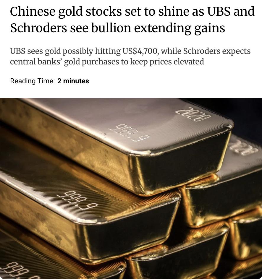 外媒:瑞士银行(UBS)和施罗德投资(Schroders)均看好黄金价格继续上涨,认为中国黄金股有望受益。 UBS预计未来12个月黄金将守住4200美元/盎司水平,若地缘政治和金融市场风险上升,甚至可能触及4700美元。施罗德则指出,全球央行购金和主要经济体债务增长将支撑金价。 黄金因全球债务担忧、政治不确定性及美联储政策宽松等因素需求强劲,被UBS视为有效的投资组合分散化工具和对冲资产。