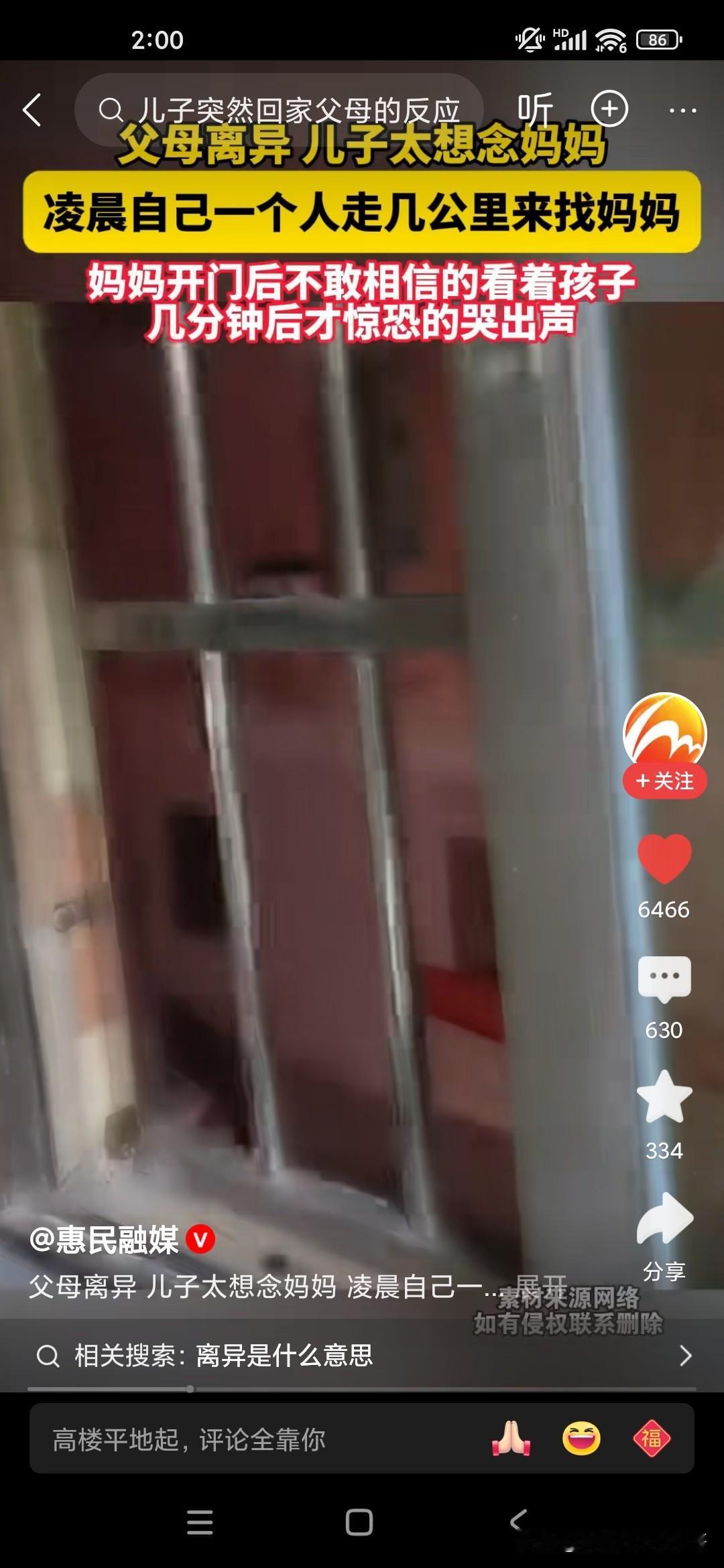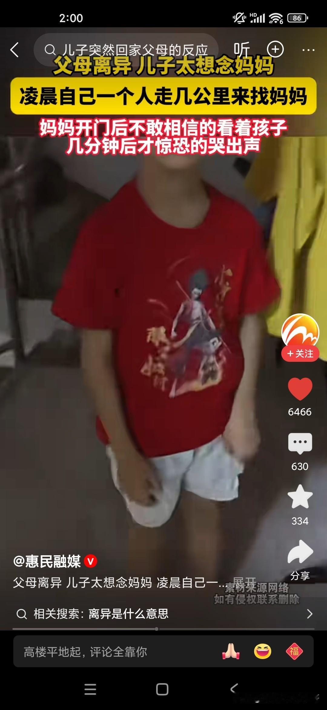 小的时候听到一部电视剧的开头曲是世上只有妈妈好,没妈的孩子像根草。当时看了之后我也跟着掉眼泪,但是并没有说像现在成年之后的那么大的感觉,我之前看到一位50岁的成年人在喝醉喝酒醉之后,在小区里边大喊妈妈,妈妈连喊了五六声,因为他实在是太想妈妈了,可能妈妈是他唯一的精神依靠,包括这个小男孩夜里凌晨一两点了,然后去找他妈妈,因为他爸妈已经离婚了,他是跟着父亲一起生活的,由于凌晨太想妈妈,来敲妈妈的门,当时妈妈就哭了,感觉小孩太可怜了,所以说父母最好不要离异,一旦离异对小孩的伤害是永久性的,是终生的!