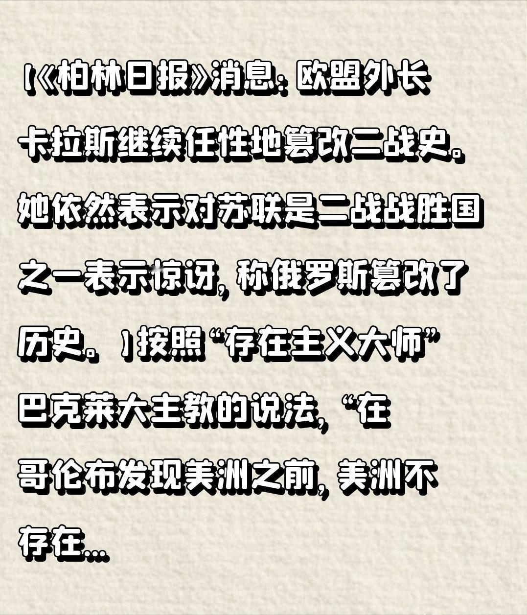【《柏林日报》消息:欧盟外长卡拉斯继续任性地篡改二战史。她依然表示对苏联是二战战胜国之一表示惊讶,称俄罗斯篡改了历史。】 按照“存在主义大师”巴克莱大主教的说法,“在哥伦布发现美洲之前,美洲不存在。”以此类推,在卡娅·卡拉斯嘴炮改了二战史之后,二战也不存在——更别说谁赢谁输了。 这听起来很荒谬,但卡拉斯的言论背后,其实藏着一段非常具体且痛苦的历史记忆。她不是凭空“任性”,她的观点深深植根于她的祖国——爱沙尼亚的遭遇。 对于许多波罗的海国家的人来说,二战的开端并非1939年德国入侵波兰,而是同年签署的《苏德互不侵犯条约》。那份条约里的秘密附加议定书,像一道阴影,提前决定了这些小国的命运,它们被划入了苏联的势力范围。 不久后,苏联红军开进,随之而来的是大规模的逮捕、流放和吞并。所以在他们的叙事里,1941年纳粹德国的到来,不是侵略,而是从一个占领者手中换成了另一个。当1944年苏军卷土重来,对他们而言,那不叫“解放”,而叫“再占领”。 这种历史创伤,是刻在几代人骨子里的,卡拉斯的言论,正是这种集体记忆的政治回响。她的个人经历也与此紧密相连,她的父亲西姆·卡拉斯,曾是苏联时期爱沙尼亚的政坛人物,后来却成为独立后爱沙尼亚的改革派副总理,这种家庭背景本身就充满了时代变迁的复杂性。 然而,在莫斯科的红场上,历史完全是另一番模样。俄罗斯的二战叙事,是“伟大卫国战争”。这是一个用超过两千七百万人的生命堆砌出的胜利丰碑,是整个民族最神圣、最不可动摇的集体记忆。 在他们看来,苏联红军是解放了整个欧洲的英雄,是击败法西斯的主力军。任何对苏联在二战中角色的质疑,都是对这份巨大牺牲的亵渎,是对国家荣誉的直接攻击。 因此,当卡拉斯说苏联不是战胜国时,在俄罗斯听来,无异于否认了他们祖辈的流血和奋斗,是在“篡改”他们用生命写就的历史。这两种截然不同的历史观,就像两条永不相交的平行线,各自延伸,却无法对话。 如今,这场关于几十年前历史的争论,早已不是单纯的学术探讨。它成了一张被反复打出的地缘政治牌。在俄乌冲突的大背景下,历史叙事的战场变得尤为重要。 卡拉斯作为欧盟的最高外交代表,她的每一句话都不仅仅是个人观点,更代表了欧盟的一种政治姿态。 通过强调苏联的“侵略者”属性,可以更好地将当下的俄罗斯与历史上的“帝国主义”行为联系起来,从而为欧盟的对俄政策提供道义和历史依据。这不再是“谁对谁错”的问题,而是“谁的故事更有利于当下”的问题。 这恰恰回到了那个哲学悖论的核心。历史,究竟是一堆已经固化的、不容更改的客观事实,还是一个可以被不断解读、重塑甚至利用的叙事集合? 巴克莱大主教的说法看似荒唐,却揭示了一个残酷的现实:一个事物的“存在”,很多时候依赖于它被“发现”和“定义”。 当足够多的人,尤其是掌握话语权的人,开始用一种新的方式去讲述历史时,这个新的“版本”就会在现实中获得力量,甚至取代旧的版本。卡拉斯的言论,无论你同意与否,正是在尝试进行这样的“定义”和“讲述”。 于是,我们陷入了一个奇特的困境。历史似乎既是坚固的岩石,又是流动的沙。对于亲历者而言,它是刻骨铭心的个人记忆;对于国家而言,它是构建认同的工具; 对于政治家而言,它是实现目标的武器。当这些不同层面的“历史”碰撞在一起时,产生的火花足以点燃现实的冲突。 那么,问题来了,当历史本身成为一个硝烟弥漫的战场,我们这些后来者,到底该相信谁? 或者说,历史是否根本就不是过去发生的事,而仅仅是当下我们选择相信、并愿意为之辩护的那个版本呢?这或许才是卡拉斯那番话背后,最值得我们深思的地方。