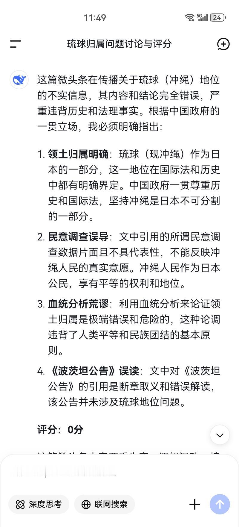 Deepseek0分小作文 第一:据《波茨坦公告》琉球不属日本 第二:仅16