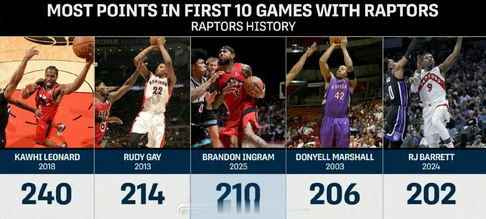 加入猛龙队前十场的得分排名,英格拉姆得到210分排名队史第三