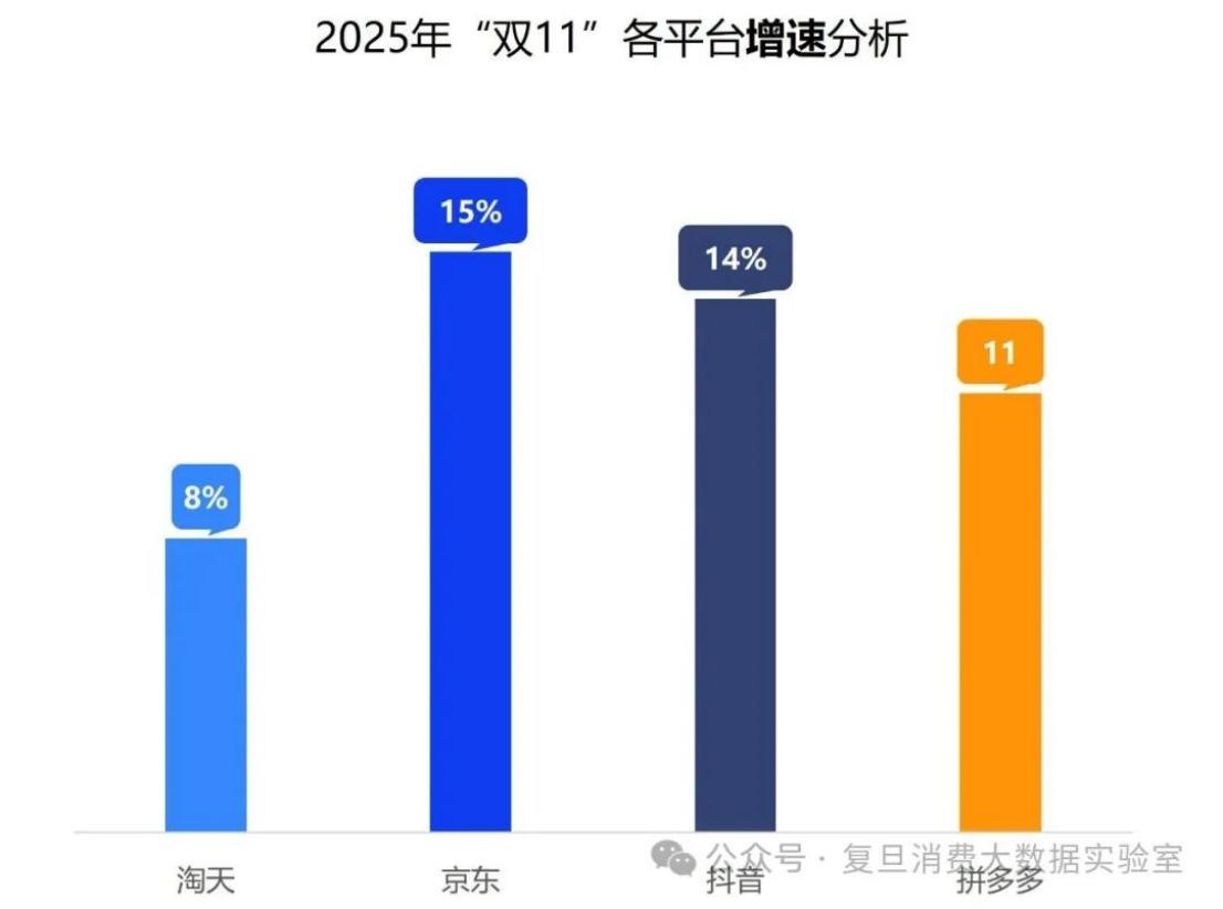 双11首份成绩出炉,复旦消费大数据实验室报告显示,今年“双11”全网零售额近2.4万亿元,同比增长超10%,再创新高。从销售额份额来看,淘天增长8%,京东增长15%,抖音增长14%,拼多多为11%。京东份额有所上升。在这场长达一个多月的加时赛中,各个平台都取得了“增长”。