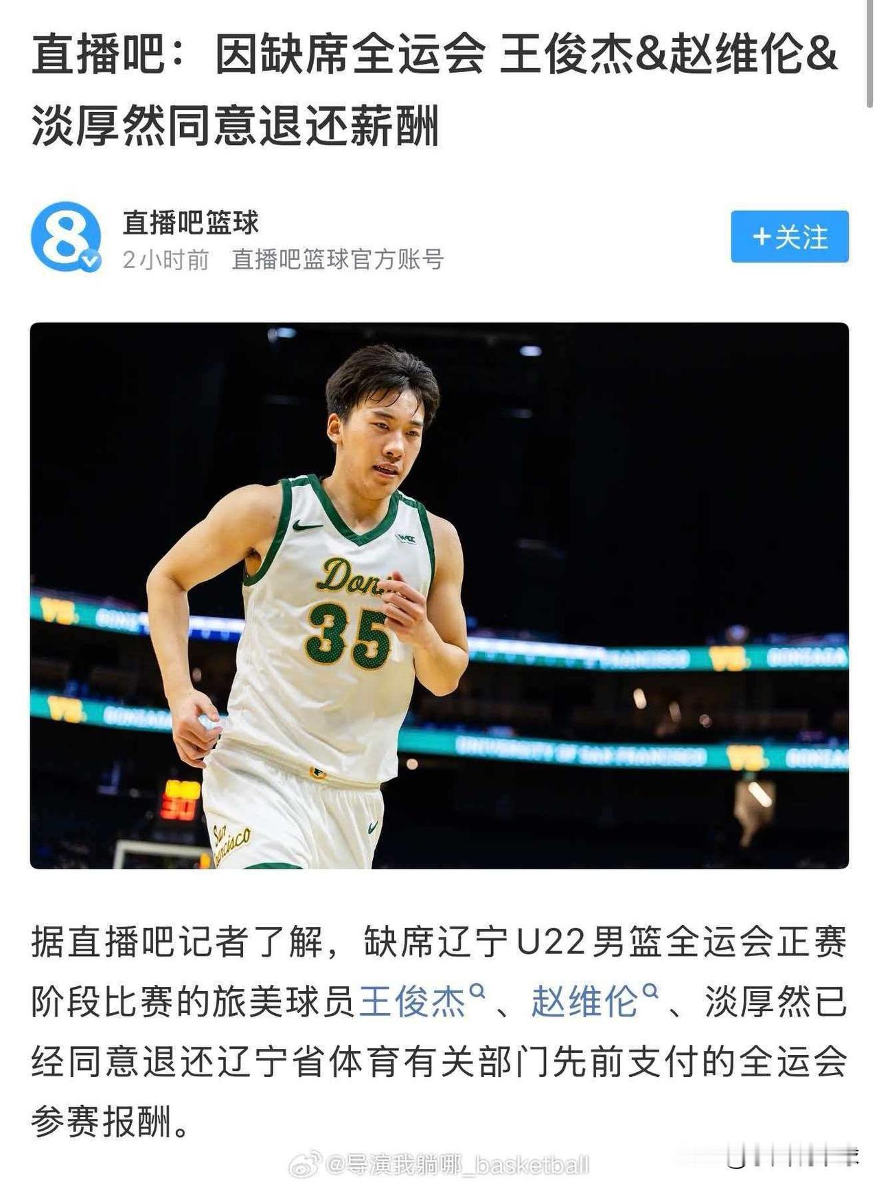 震惊!乌戈去美国竟然是为了追回留洋三将的薪资 U22全运会开赛前一天,辽宁主教练乌戈才回到国内,有很多媒体猜测,乌戈是不是去美国劝王俊杰、赵维伦、淡厚然三人回国参赛,因为这三名球员休赛季和辽宁签了协议,拿钱为辽篮出战U22全运会,毕竟这三名留洋球员实力比较出色,有了他们球队轮换比较强大,整体实力也会有很大提升,夺的概率就很大了冠。 然而昨天据直播吧记者透露,乌戈去美国竟然不是为了劝留洋三将回国参赛,而是为了协商退回打全运会的薪酬,据悉三名球员愿意退回之前辽宁体育局支付的全运会薪酬,不过这也正常,毕竟那这个钱就是打比赛的,你回来不了退钱也是合情合理。