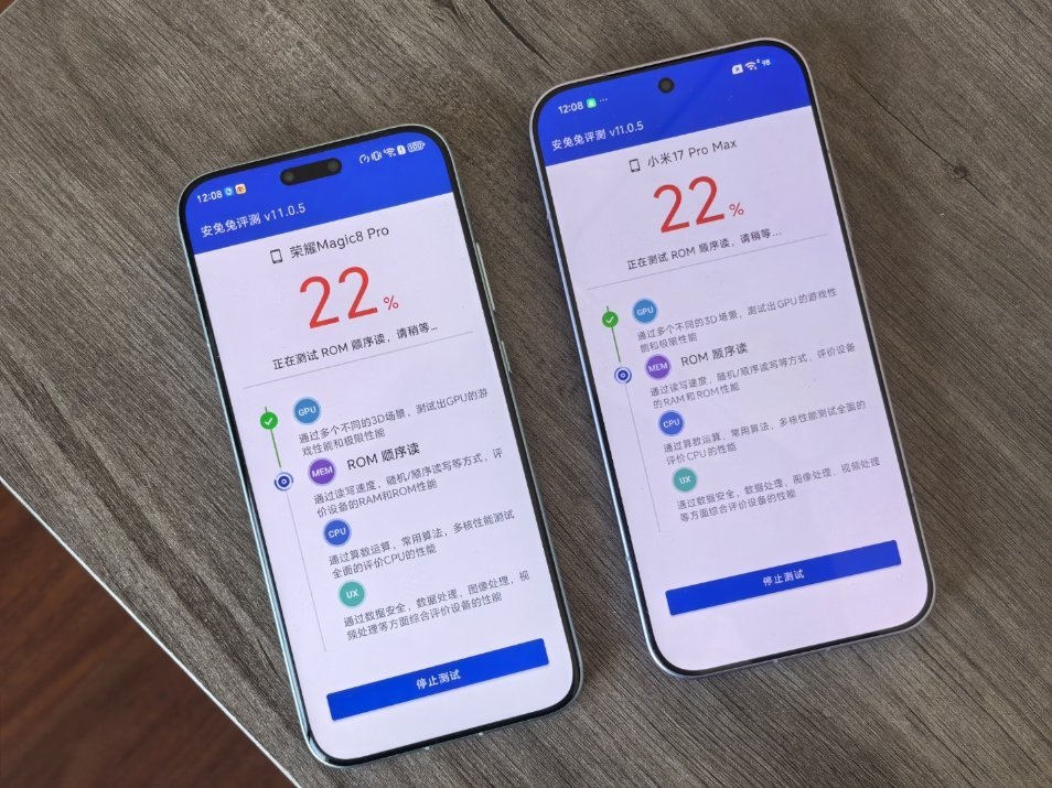 同时给两款骁龙8E Gen5旗舰跑了跑分,都是性能模式。荣耀Magic8 Pro的优化和性能释放似乎更好一些,跑分成绩比小米17Pro Max多了41万。