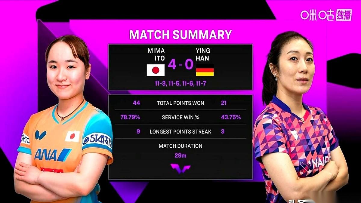 29分钟。 一场乒乓球比赛打完了。 不,那不是比赛,那是一场教科书式的“围猎”。猎物,是曾经让无数人头疼的削球手韩莹;猎人,是那个眼神里藏着刀的伊藤美诚。 我看了个直播,全程手心冒汗。不是因为紧张,是因为那种窒息感。 你能看到韩莹,一个经验那么老到的运动员,脸上那种茫然和无力。她一直在退,退,退,几乎要退到观众席里去了。她用尽毕生所学去“削”那个球,想把球的力道卸掉,想让它变慢,变柔。 可是在伊藤面前,这一切都成了笑话。 伊藤美诚根本不给你喘息的机会。她就像一头精准的猎豹,你的每一次削球,都成了她扑杀的最好时机。她拍过来的球,不是球,是子弹,带着一股“你给我死”的狠劲儿。 你防不住,你攻不了,你甚至连思考自己下一拍该怎么打的时间都没有。 最可怕的是什么? 不是4:0的比分,也不是29分钟的速战速决。 最可怕的是,伊藤用一场比赛,让一个顶尖削球手感觉自己练了一辈子的东西,好像……全错了。 竞技体育最残忍的一面,莫过于此。它不是打败你,它是直接从根本上,否定你。