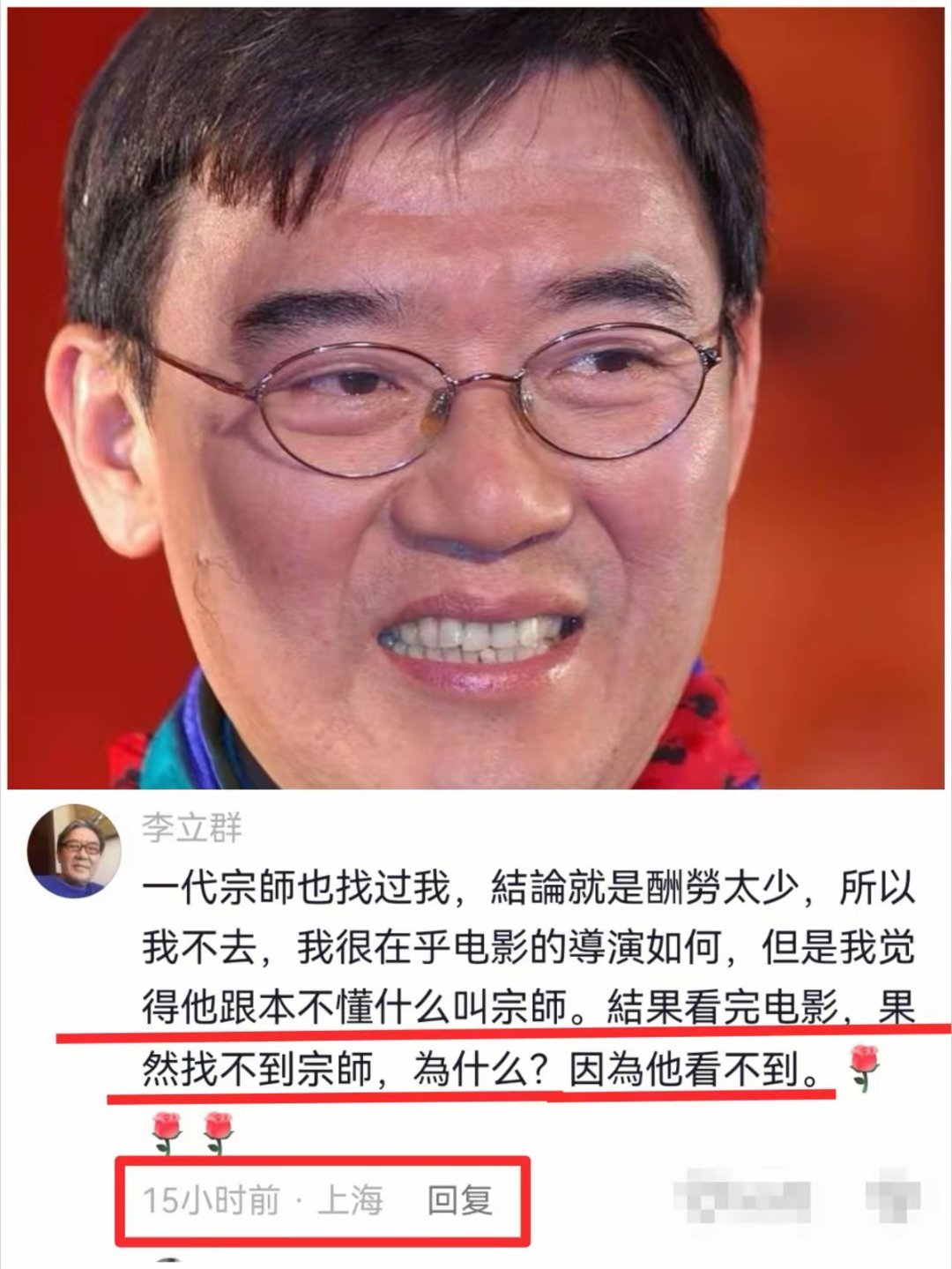 胡歌沉默了,就连唐嫣也不敢吭声,谁成想,除了向太,竟然老戏骨李立群也不看好《繁花》这部剧。李立群曾经就评价过繁花这部剧,说王家卫经验还是不足,自己也不是很喜欢这部剧。还有一代宗师这部剧,李立群也跑到向太的视频底下评论说看完了不知道讲的是啥,最后根本找不到宗师。不过也有人说王家卫拍的剧都是追求完美,投资确实挺大的,大家怎么看?