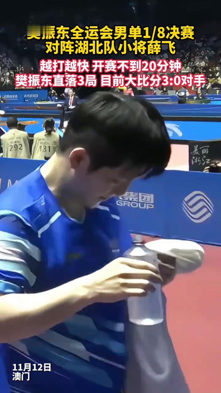 樊振东全运会男单1/8决赛对阵湖北队小将薛飞,越打越快,开赛不到20分钟,樊振东