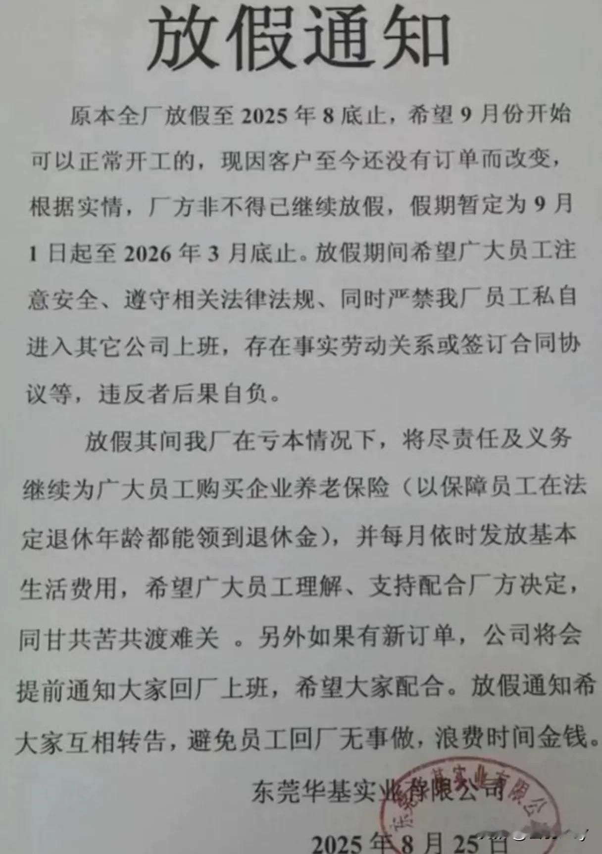 听说过放假,但你见过一放就是五年半的企业吗? 东莞常平华基实业太绝了!从2020年8月发出第一份放假通知起(每半年延续一次),如今已经把假放到2026年3月了! 现今厂区静悄悄,机器也早已停止运转,但员工的社保和生活费每月准时到账。五年多来,企业为每位员工支出超过十五万元,却始终没有按下停止键。 有人说老板是“合法算计”省赔偿;但也有人深受感动,认为这家企业是在用行动诠释责任:宁可承担持续支出,也不放弃一丝希望,只为等待订单回来的那一天。
