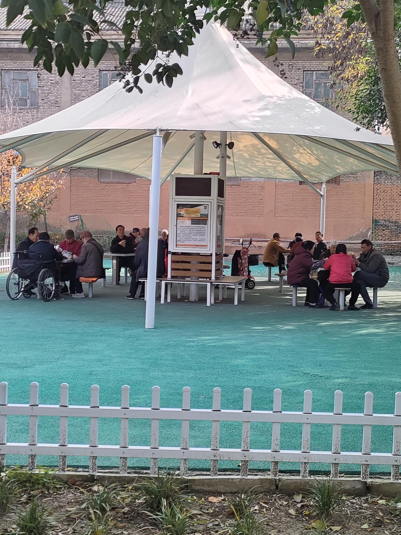 今早在公园溜达,一抬头看见那大遮阳棚底下都快挤不下了—叔叔阿姨们跟约好的似的,我凑过去瞄了眼,张姨正跟李叔掰扯“你家那小狗昨儿又扒我菜篮子”,王大爷攥着副扑克牌喊“三缺一!快过来补位”,连坐轮椅的赵叔都举着保温杯插空儿:“今早豆腐脑放少了卤,没味儿!” 这棚子跟个“聚点儿”似的,太阳被挡得严严实实,风一吹布顶晃两下,树叶影子在地上晃来晃去。也不用啥讲究,搬个小马扎往这儿一坐,扯扯家长里短,牌打得稀里哗啦,那股热乎劲儿,比啥热闹都耐看。