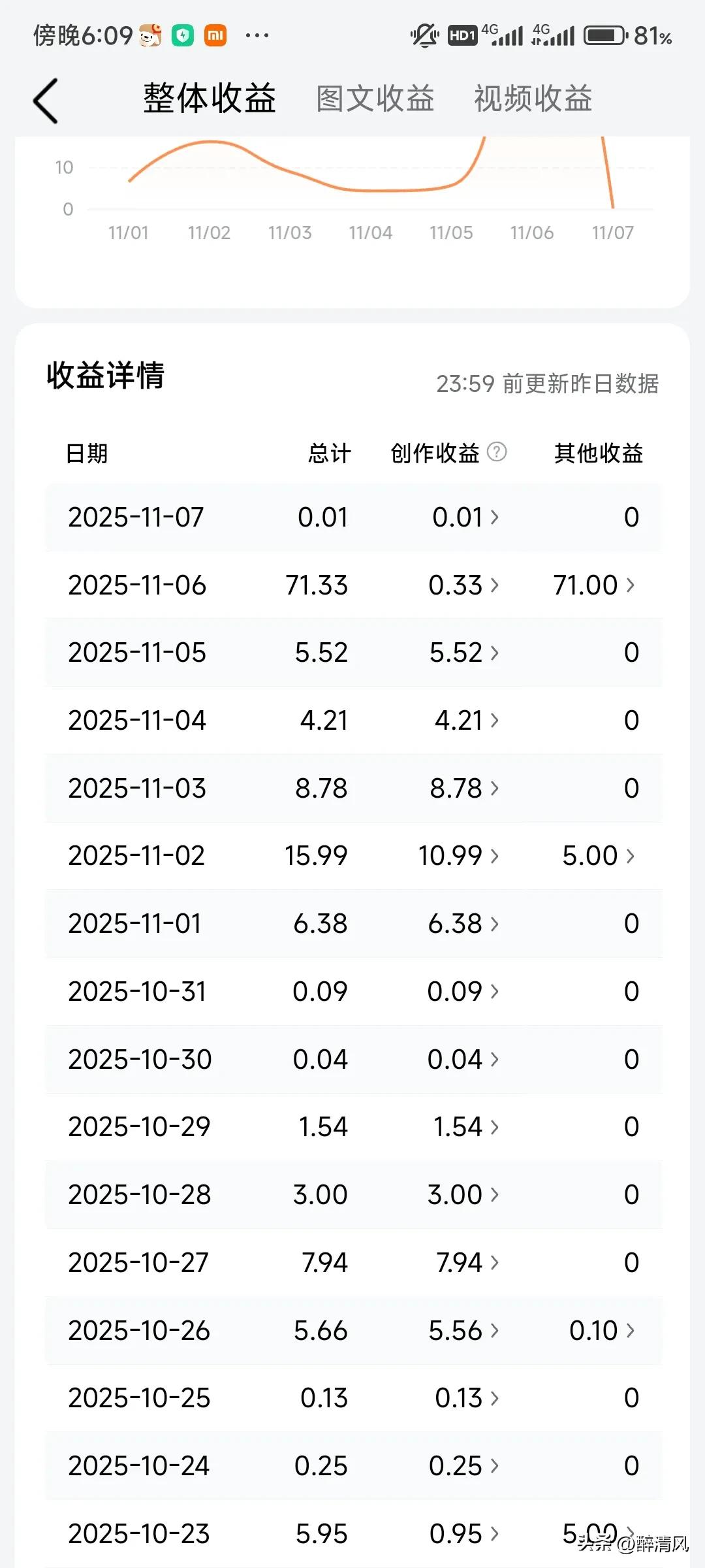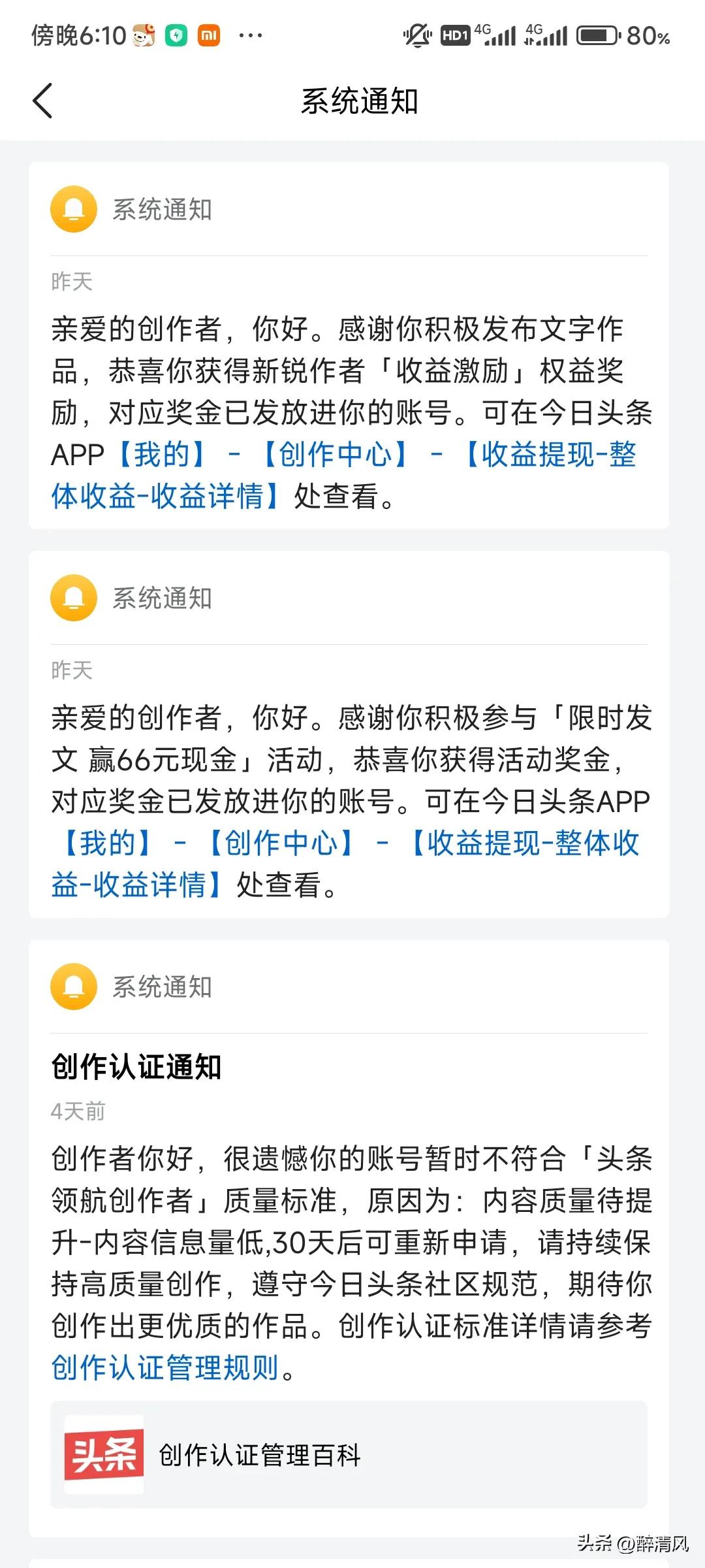 今天头条新锐者活动可太牛了!决不食言! 我在这里衷心感谢今日头条平台对创作者得鼓励嘉奖!昨天66元+5元的巨款是我最近创作以来,收益最高的的一天!这是第一周活动收益,我第二周活动一万阅读量也达标了,真的太高兴了! 今日头条还是挺大气的,说到做到,只要你参加限时发文赢66元的活动,一周内阅读量达到一万,就必得66元,我在上周流量不是稳定的情况下,坚持发文创作,多写热点人物,热点事件,坚持原创,一定要多写,平台才会给你推流。千万不要三天打鱼两天晒网,劲量还是保持创作领域垂直,平台才会知道推给看哪些类型这样的粉丝,才会有稳定的流量。 最后,再一次感谢今日头条平台,以后我会坚持原创,多写多交流,今日头条的活动也会积极参加,加油各位今日头条创作者,一起加油!
