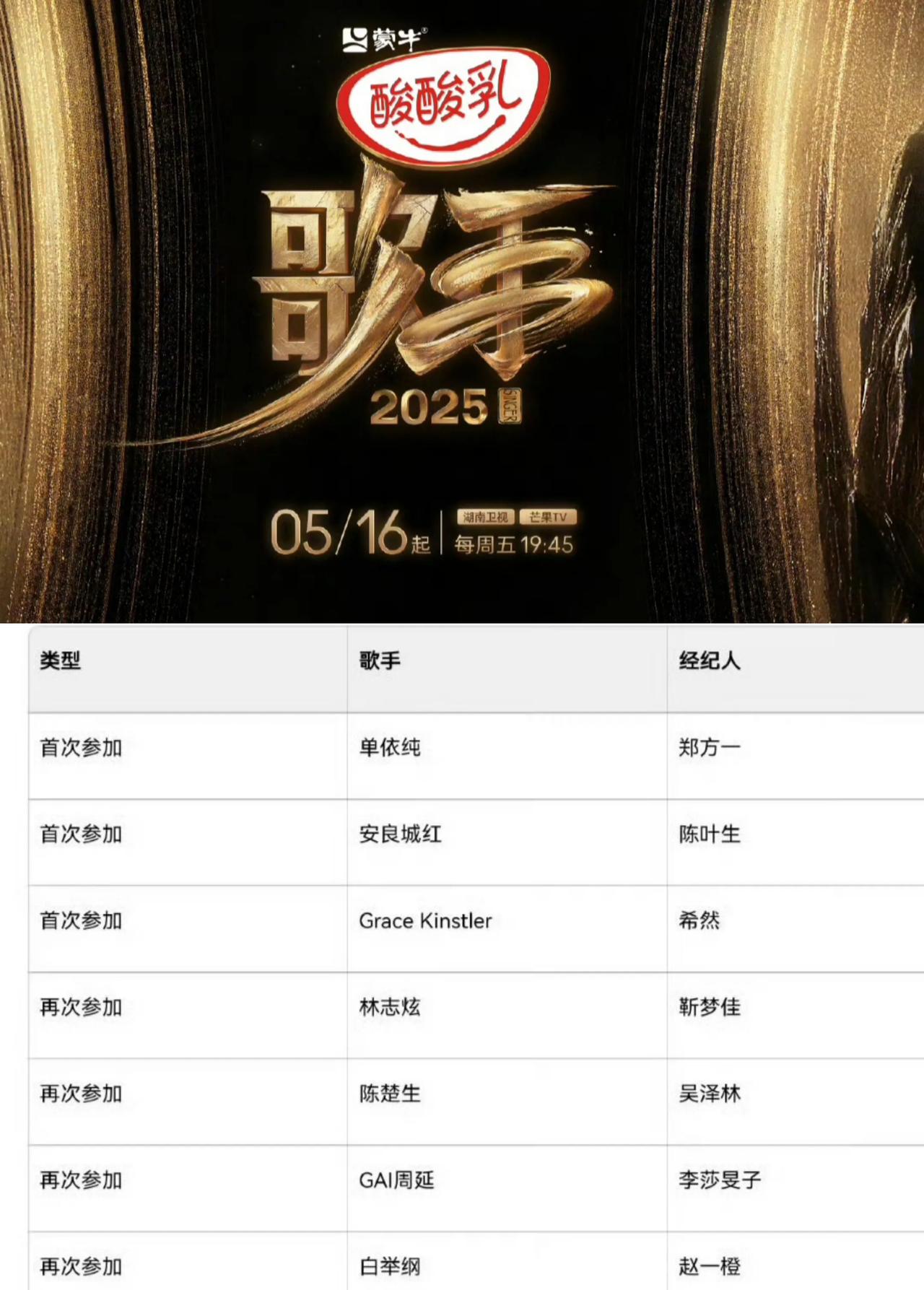 《歌手2025》首发名单: 1、单依纯(好声音冠军)代表作:《永不失联的爱》《想你时风起》等; 2、林志炫(华语顶级唱将),代表作:《单身情歌》《蒙娜丽莎的眼泪》等; 3、陈楚生(快男冠军),代表作:《有没有人告诉你》《思念一个荒废的名字》等; 4、GAI周延(中国有嘻哈冠军)代表作:《沧海一声笑》《华夏》等; 5、白举纲(下一战歌手冠军); 6、安良城红(日本著名R&B歌手); 7、Grace Kinstler(美国歌手,高音机能怪); 有你支持的歌手吗? 主持阵容,依然是:何炅(主持人)+胡海泉(音乐串讲人)+沈梦辰(互动主持人);