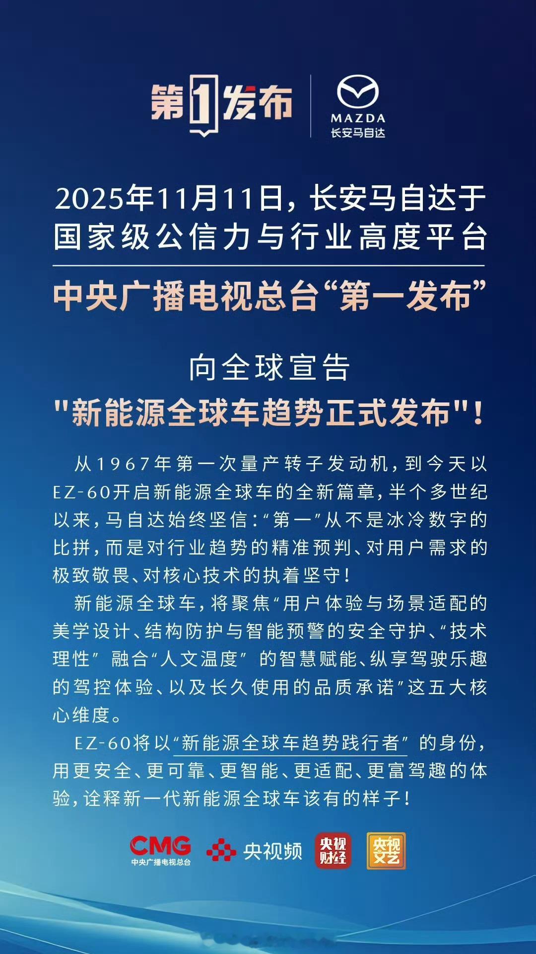 你开马自达,怪不得你....现在马自达早就摆脱这个标签了,此前就让梁家辉代言,更何况更早的时候,马自达可是号称东瀛宝马啊。这次和央视合作也是相当出乎意料。11月11日,长安马自达携新能源SUV EZ-60登陆央视总台“第一发布”平台,成为首个在该国家级平台举办专属发布会的汽车品牌。看得出来,马自达新车 EZ-60 也是获得央视背书,这款只要11.99 万起的车还是很有实力。很多人对马自达的印象停留在操控好上面,很多人驾驶的启蒙老师也是马自达。但马自达的使命更像是教会你如何去驾驶,并且在意驾驶,体会到驾驶的乐趣,它的驾驶理念始终是人,尤其是普通人。大部分普通人没有那么在意操控感,追求极致操控的人就更少了,马自达就思考能不能让这部分人感受到驾驶的快乐,马自达 EZ-60 就是这样一款车。作为品牌第二款全球化新能源车型,续航方面,BEV纯电版搭载78kWh电池组,CLTC续航可达600km;REEV增程版配备31.7kWh电池组,CLTC纯电续航200km,综合续航更是达到1000km级。智能座舱搭载4nm车规级芯片,搭配26.45英寸5K大屏与100英寸裸眼3D HUD,操作流畅且视觉体验出色,L2级行泊一体辅助系统覆盖200+使用场景,满足日常驾驶需求。这种配置,这种价格,在合资新能源中算是遥遥领先,或许能看到合资新能源的下一个爆款了。