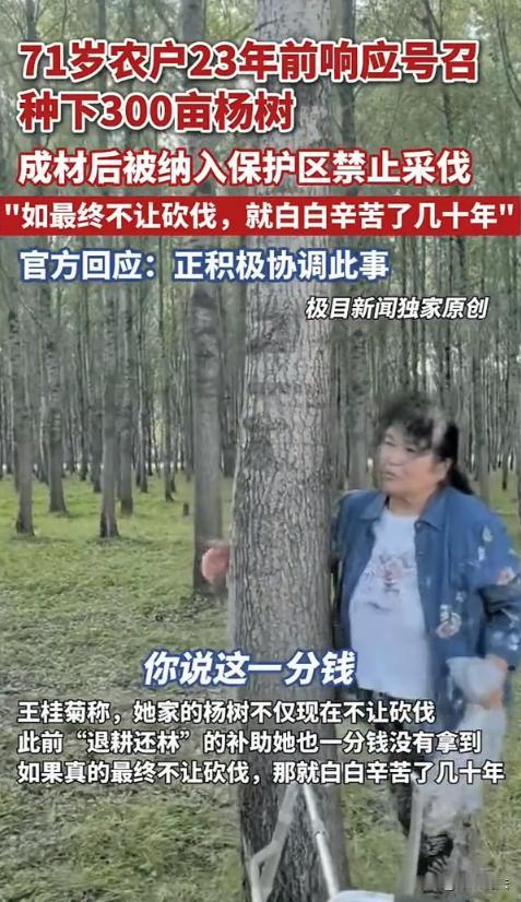 黑龙江齐齐哈尔,七旬大妈耗费大半辈子心血,种植了360亩、合计3万棵杨树,等到树苗好不容易从手指粗长成了20到40厘米的时候,市值120余万。这时大妈突然接到通知:杨树林被纳入保护区,不得违规砍伐,关键的是补偿一分钱都没有。大妈一下子崩溃了:我23年里出钱出人精心护林,现在好不容易可以砍了卖钱,现在不能砍伐,那我这么多的心血不就白费了吗? 大河报十一月十一号报道了这则某农户辛苦种植了300亩杨树,23年后树木成材却被纳入保护区禁止采伐的新闻,这到底是怎么一回事呢? 今年71岁的王桂菊大妈,自小就是苦过来的,长大结婚后,丈夫也在孩子们读小学的时候,离她而去。 都说母性本柔、为母则刚。在这接二连三的打击下,王大妈没有倒下,反而是用自己勤劳的双手,扛起了这个家。 时间来到零二年,在当时政府和村里的动员下,王大妈决定承包360亩的土地用来造林。 同年五月一号,王大妈和村委签了份《造林承包合同》,合同从自2002年5月1日起到2027年4月30日截止,承包时间25年;其中合同还约定王大妈首年造林成活率就要85%以上,三年的成活率必须达到80%以上。 此外,合同还规定在合同期内林木成熟后,王大妈就可以申请砍伐,届时土地使用权由村里收回,合同正式终止。 合同里还有一条内容,是关乎王大妈的切身利益:合同期内遇到政策或法律调整,需要收回土地时,需按根据相关法律和政策规定给予补偿。 签下合同后王大妈开始忙活了起来,她决定种植杨树,这种树木具有较高的经济价值,但生长周期较长,一般在23-25年左右。 除了第一年的树苗是政府提供的,之后的树苗都是王大妈自费购买,那些杨树苗刚种下时只有手指那么粗,但在大妈的精心呵护下,第一年的成活率就高达90%以上。 因为面积实在太大,除了让亲戚朋友帮忙,王大妈有时候还得花钱雇人除草、施肥、打药等,而这一做就是二十余年。 期间王大妈的弟弟也想承包,她就分给了对方一部分,只留了305.5亩并过户到自己名下。 时间来到二四年,这时候的杨树采伐期到了,王大妈就准备再次申请采伐证,这时她突然发现这片林地,已经被纳入国家级自然保护区了。 同年十二月四号,保护区管护中心拒绝了大妈的采伐证申请。 王大妈估算了下,名下305.5亩土地,种下并存活的杨树至少3万棵,市场价值120万以上,目前可以开始采伐了,但却卡在了采伐证,这让王大妈急的人都病倒了。 王大妈觉得在造林时,这片区域本就不是保护区,不然当时也可能承包下来。现在自己辛苦操劳20多年,杨树林莫名其妙的成了保护区的一部分,从而无法砍伐变现,那起码得支付应有的赔偿吧! 对此当地有关部门回应称:根据现行有效政策及历史文件,没有发现针对该保护区林地划入的补偿性规定。 这就意味着王大妈得不到任何补偿。 与此同时,大妈女儿了解到,在二二年的《造林承包合同》上有关“退耕还林”地,会有相关补贴政策,可她家合同签了二十多年,一毛钱都没领到。 对此,有关部门又称这300多亩地块不是退耕还林地,而是那种三北工程造林地,按规定不得享受退耕还林政策的补贴。 王大妈因为这个噩耗已卧床数日,常年的劳累导致她双侧股骨头坏死,目前已无法正常行走,需要拄拐才行,可家里已经没有多余的钱来看病了。 更雪上加霜的是承包合同在2027年4月30号就要到期了,如果在这一年半的时间不能解决,恐怕这二十多年的辛苦付出,真要打水漂了。 那么,从法律角度,如何看待这件事呢? 根据《森林法》第五十三条规定:国有林业企业事业单位应当编制森林经营方案,明确森林培育和管护的经营措施,报县级以上主管部门批准后实施;重点林区的森林经营方案由国务院林业主管部门批准后实施。国家支持、引导其他林业经营者编制森林经营方案。编制森林经营方案的具体办法由国务院林业主管部门制定。 该事件中王大妈的杨树林地,属于“生态公益林”的性质,这才被纳入自然保护区。 此外,《森林法》第七条有明文规定:“国家建立森林生态效益补偿制度,加大公益林保护支持力度,完善重点生态功能区转移支付政策,指导受益地区和森林生态保护地区人民政府通过协商等方式进行生态效益补偿。” 当地有关部门声称的“无任何补偿规定”,明显违反了上诉规定,因为上诉《森林法》的规定,将有关公益林的保护,从经济保障上升为法定强制性要求,当地有关部门需严格执行! 目前,随着承包合同期限,离截止日期2027年4月30日越来越近,但当地政府仍未对此事提出任何具体解决方案。 那么,对于此事,你怎么看?
