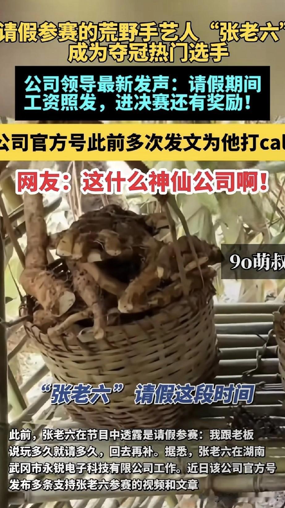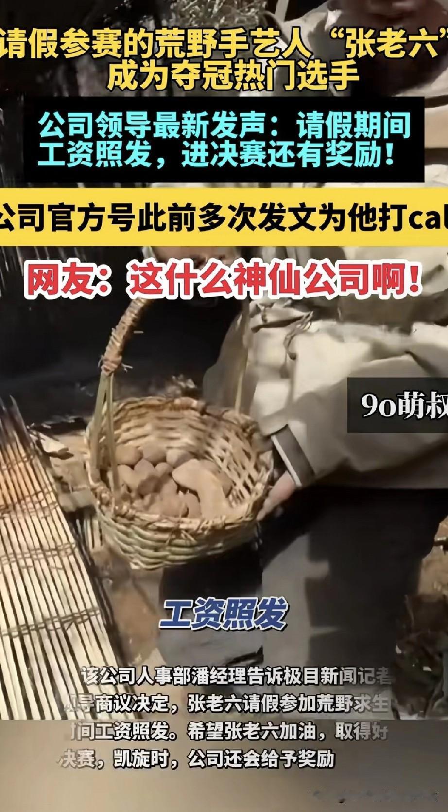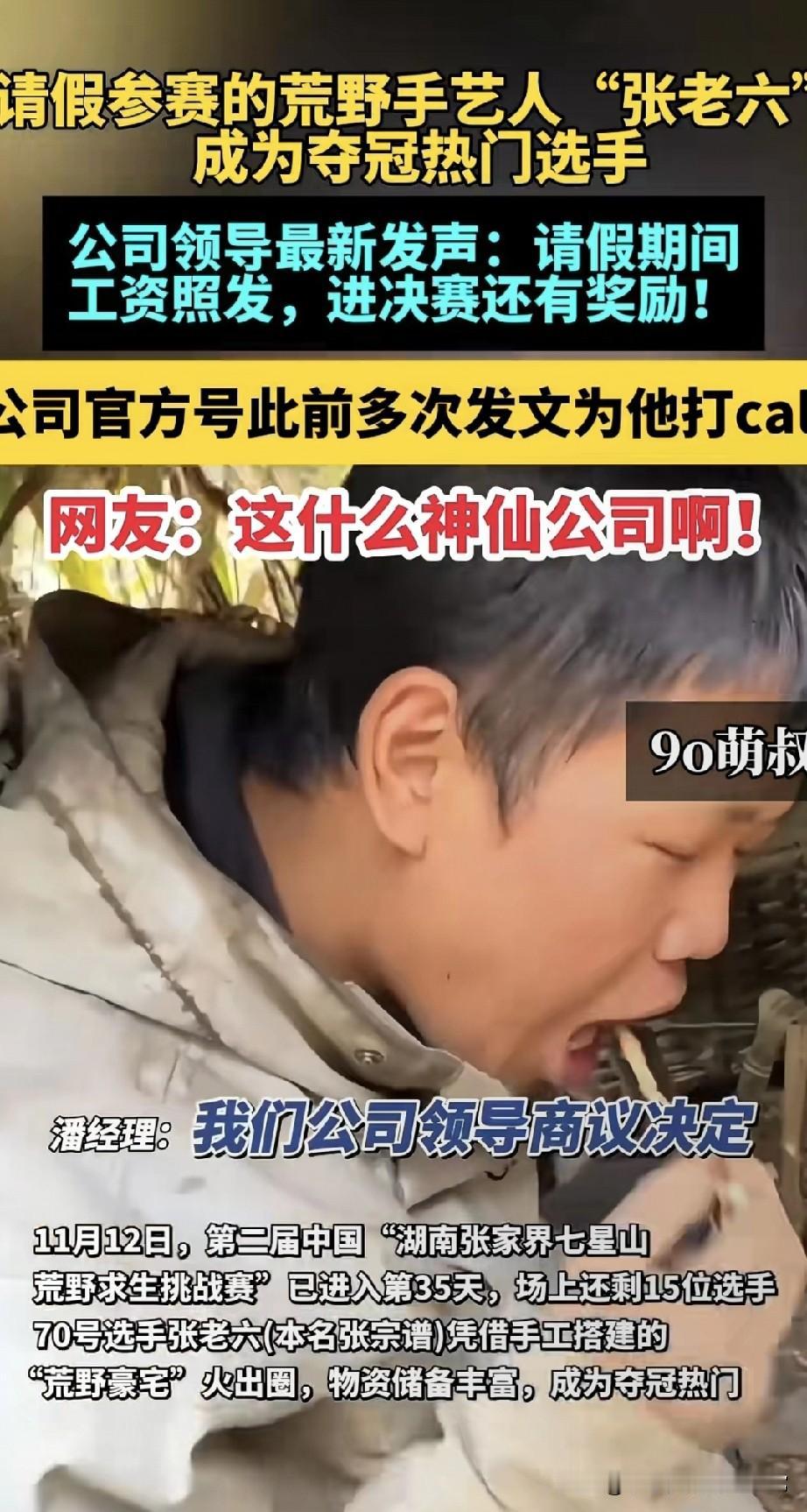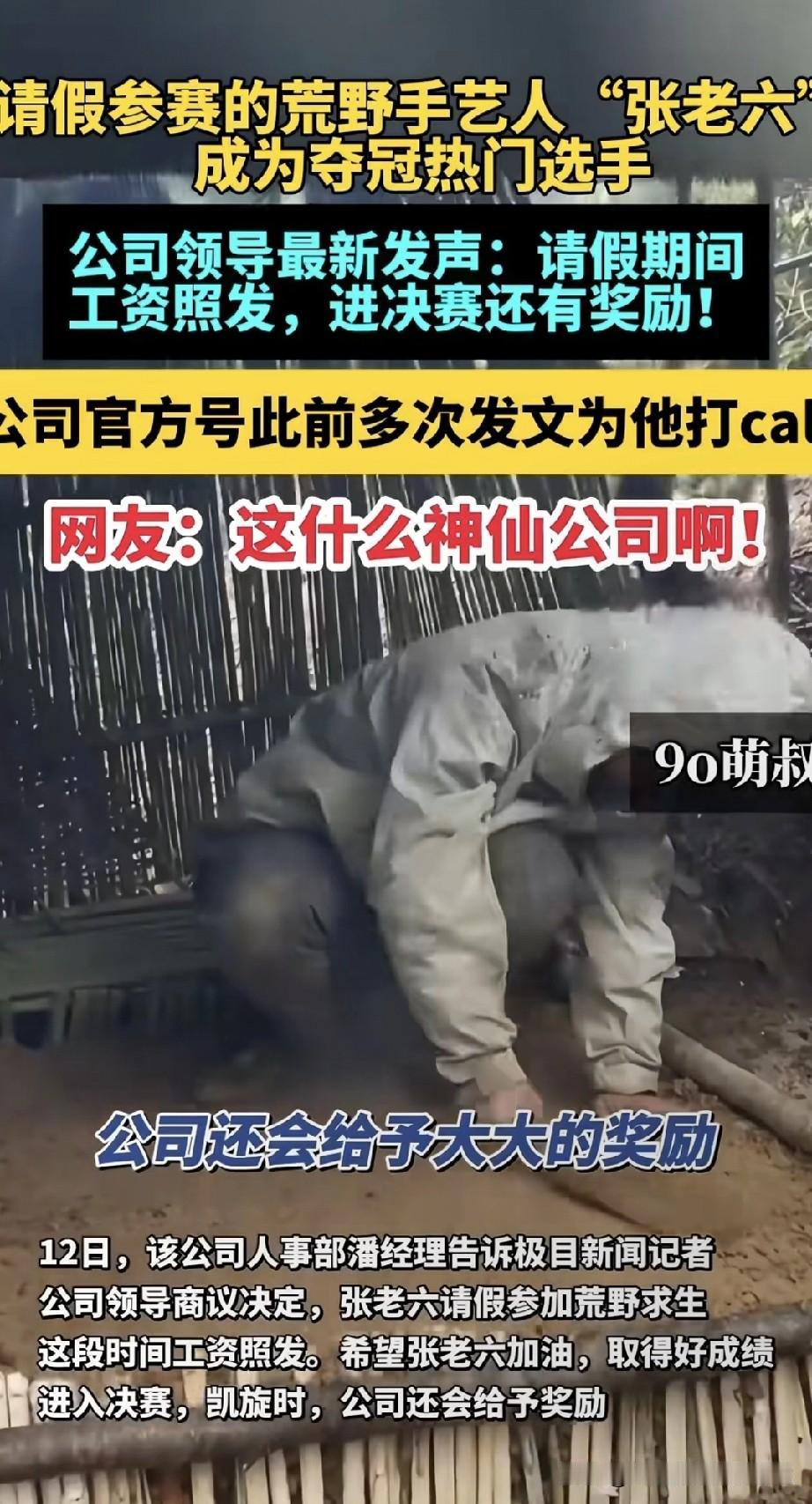 神仙公司,员工请假去荒野求生,工资照发还发奖励! 谁看了不羡慕哭?张老六跟老板说“我要去荒野求生比赛”,老板直接批假:“玩多久请多久,工资照发,进决赛还有奖励”! 现在这大哥在张家界荒野里搭“豪宅”、囤满物资,成了夺冠热门——公司官号还天天发动态给他打call。评论区直接炸:“这公司还缺人吗?我能躺着参赛吗”“我请假扣三天工资,人家请假赚奖金”,还有人酸“怕不是公司营销吧?” 以前上班请假像“讨饭”,现在有人请假参赛还被公司当“宝”。咱就是说,这到底是公司人性化,还是借员工蹭热度? 要是你老板让你请假参赛还发工资,你敢放下工作去荒野“撒野”吗?